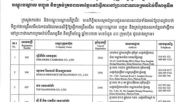 ក្រសួងការងារ បង្ហាញបញ្ជីឈ្មោះ ក្រុមហ៊ុនស្របច្បាប់ ក្នុងការជ្រើសរើស បណ្តុះបណ្តាល បញ្ជូន និងគ្រប់គ្រងពលករ ទៅធ្វើកម្មសិក្សា និងធ្វើការនៅ ប្រទេសជប៉ុន
