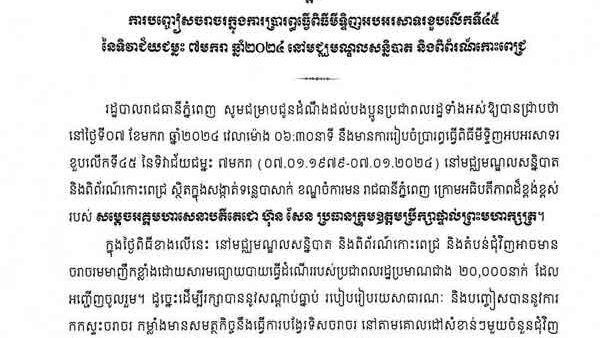 រដ្ឋបាលរាជធានីភ្នំពេញ ជូនដំណឹងពី ការបញ្ចៀសចរាចរណ៍ ដើម្បីរៀបចំ មីទ្ទិញអបអរសាទរ ខួបលើកទី៤៥ នៃទិវាជ័យជម្នះ ៧មករា
