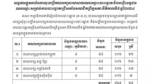 សេចក្តីប្រកាសព័ត៌មាន លទ្ធផលផ្លូវការ នៃការចុះបញ្ជី គណបក្សនយោបាយ ឈរឈ្មោះបោះឆ្នោត និងបញ្ជីបេក្ខជន ឈរឈ្មោះ សម្រាប់ ការបោះឆ្នោត ជ្រើសតាំងសមាជិកព្រឹទ្ធសភា នីតិកាលទី៥ ឆ្នាំ២០២៤