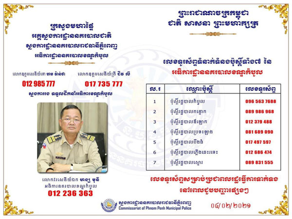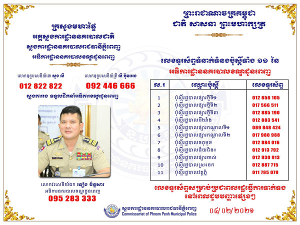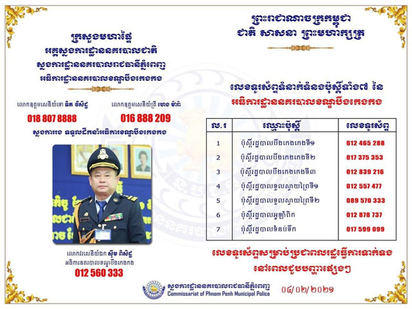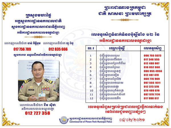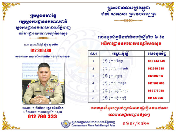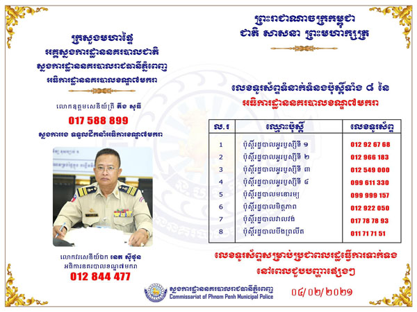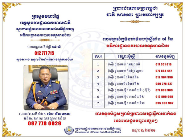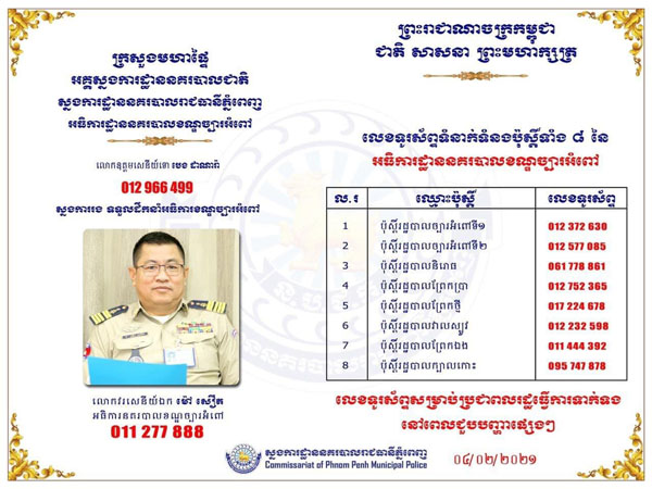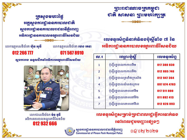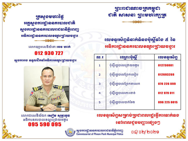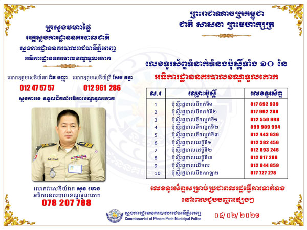 រាជធានីភ្នំពេញ ៖ សំដៅបង្កភាពងាយស្រួលដល់ប្រជាពលរដ្ឋ ដើម្បីទាក់ទងផ្ទាល់ទៅស្នងការរង អធិការទាំង១៤ និងនាយប៉ុស្តិ៍ទាំង១០៥ ក្នុងរាជធានីភ្នំពេញនោះ ស្នងការនគរបាលរាជធានីភ្នំពេញ បានបង្ហាញលេខទូរស័ព្ទជាសាធារណៈដូចខាងក្រោម ៖