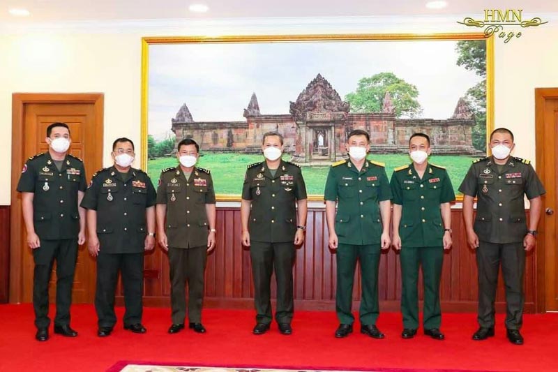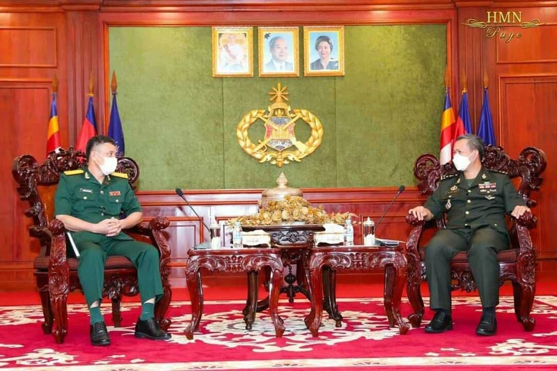 រាជធានីភ្នំពេញ ៖ កាលពីរសៀលថ្ងៃទី២១ ខែកញ្ញា ឆ្នាំ២០២១ ឯកឧត្តម ឧត្តមសេនីយ៍ឯក ហ៊ុន ម៉ាណែត អគ្គមេបញ្ជាការរងនៃកងយោធពលខេមរភូមិន្ទ និងជាមេបញ្ជាការកងទ័ពជើងគោក បានអនុញ្ញាតឱ្យលោកវរសេនីយ៍ឯកពិសេស ង្វៀន ថាញ់ជីញ អនុព័ន្ធយោធា នៃសាធារណរដ្ឋសង្គមនិយមវៀតណាម ប្រចាំនៅកម្ពុជា ចូលជួបពិភាក្សាការងារ ទាក់ទងនឹងការវាយតម្លៃលទ្ធផលកិច្ចសហប្រតិបត្តិការផ្នែកយោធាដែលសម្រេចបានកន្លងមក និងការកំណត់ទិសដៅបន្តសម្រាប់បណ្តាឆ្នាំខាងមុខ នៅទីបញ្ជាការកងទ័ពជើងគោក នៃកងយោធពលខេមរភូមិន្ទ។