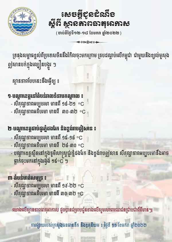 រាជធានីភ្នំពេញ ៖ ក្រសួងធនធានទឹក និងឧតុនិយម បានចេញសេចក្តីជូនដំណឹង ពីស្ថានភាពធាតុអាកាសនៅកម្ពុជា ចាប់ពីថ្ងៃទី១២-១៨ ខែមករា ឆ្នាំ២០២២ ដោយបញ្ជាក់ថា ទ្រនុងសម្ពាធខ្ពស់ពីប្រទេសចិននឹងរំកិលចុះមកក្រោម គ្របដណ្តប់លើកម្ពុជា ជាមួយនិងខ្យល់មូសុងឦសានបក់ក្នុងល្បឿនបង្ហូរ។