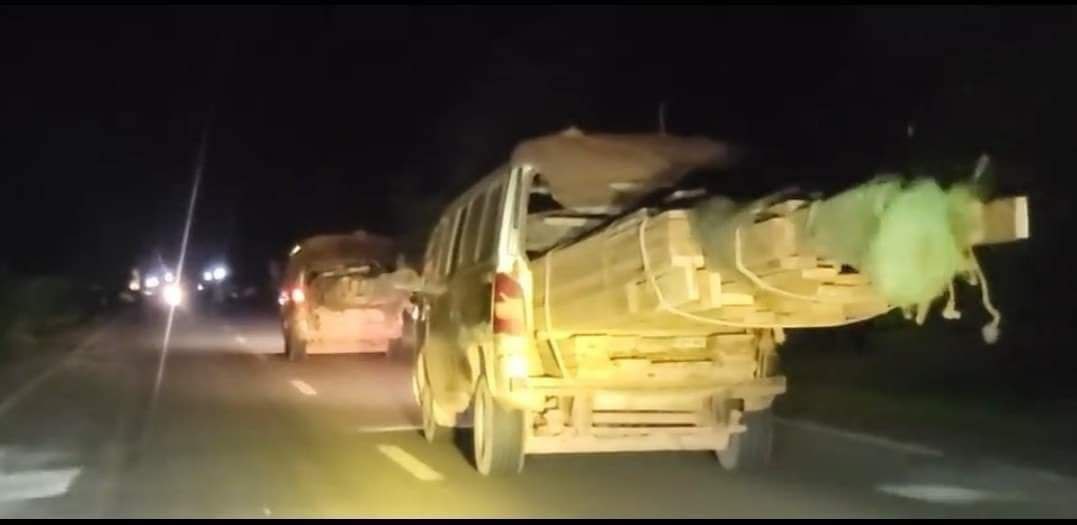 #ខេត្តត្បូងឃ្មុំ ÷ ជាក់ស្តែងនៅយប់រំលងអាធ្រាត្រថ្ងៃទី ០៧ខែ មិថុនា ឆ្នាំ ២០២២ មានសកម្មភាពរថយន្តសាំងយ៉ុង២គ្រឿង ដឹកឈើចេញពីក្នុងទឹកដី ខេត្ត មណ្ឌលគិរី ឆ្លងកាត់តាម ១០៧ តាមបណ្តោយផ្លូវជាតិលេខ៧៤ ហើយកាត់តាម គីឡូ ៨៨ ឆ្លងកាត់តាមរង្វង់មូល ទីរួមស្រុកស្នួល នៃខេត្តក្រចេះ នៅវេលាម៉ោងជាង ២ យប់រំលងអាធ្រាត្រ ឈានចូលថ្ងៃទី០៧ ខែមិថុនា ឆ្នាំ២០២២នេះ ខណ: ពេលដែលក្រុមអ្នកសារព័ត៌យើង កំពង់ឃ្លាំមើលយ៉ាងយកចិត្តទុកដាក់ចាំផ្តិតយករូបភាពជាក់ស្ដែងនោះ ស្រាប់តែឃើញក្បួនរថយន្តដឹកឈើខាងលើនេះ នៅត្រង់ចំណុច គឺឡូម៉ែត្រ ៧៩ ស្ថិតក្នុងភូមិមានជ័យ ឃុំស្រែចារ ស្រុកស្នួល ខេត្តក្រចេះ។ បាន បោះពួយយ៉ាងលឿន តាមបណ្ដោយផ្លូវជាតិ ហើយបងប្អូនអ្នកសារព័ត៌មានក៏បានតាមផ្ដិតយករូបភាពពីក្រោយ ដើម្បីទុកជាភស្តុតាង តាមរហូតដល់ត្រង់ចំណុចមុខទីស្នាក់ការមេព្រៃស្រុកមេមត់ ខេត្ត ត្បូងឃ្មុំ តែម្ដង។