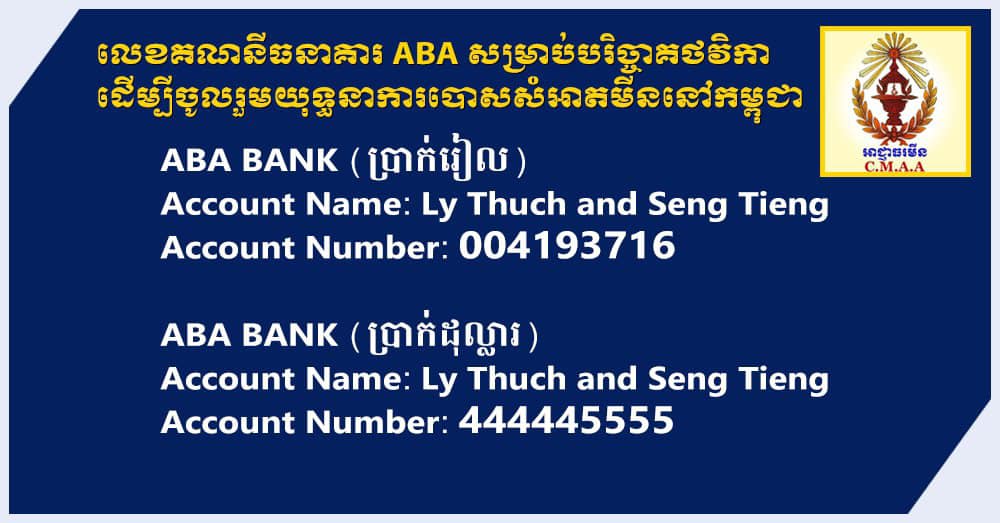 ឆ្លៀតក្នុងឱកាសនេះ ខ្ញុំសូមចែករំលែកបន្តនូវ លេខគណនីធនាគារ ABA សម្រាប់ជូនសាធារណជន សប្បុរសជន ក៏ដូចជាប្រជាពលរដ្ឋខ្មែរដើម្បីចូលរួមបរិច្ចាគថវិកា ក្នុងការចូលរួមយុទ្ធនាការបោសសំអាតមីននៅកម្ពុជា។
