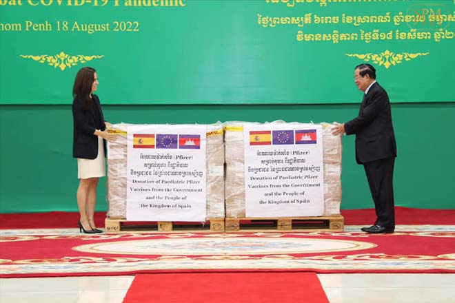 ក្នុងនាមប្រជាជន និង រាជរដ្ឋាភិបាលកម្ពុជា, សម្ដេចតេជោ បានសម្ដែងនូវអំណរគុណជូនចំពោះប្រជាជន និង រដ្ឋាភិបាលនៃព្រះរាជាណាចក្រអេស្ប៉ាញ និង បណ្តាប្រទេសជាសមាជិកផ្សេងទៀតនៃសហភាពអឺរ៉ុប ដែលបាន និង កំពុងបន្តចូលរួមចំណែកយ៉ាងសំខាន់ ក្នុងការប្រយុទ្ធនឹងជំងឺកូវីដ-១៩ ក៏ដូចជាការងើបឡើងវិញនៃសង្គម-សេដ្ឋកិច្ចកម្ពុជា តាមរយៈការផ្តល់ជំនួយវ៉ាក់សាំង ជាពិសេសម្រាប់កុមារនិង ជំនួយបច្ចេកទេសផ្សេងៗ ជាបន្តបន្ទាប់ ។