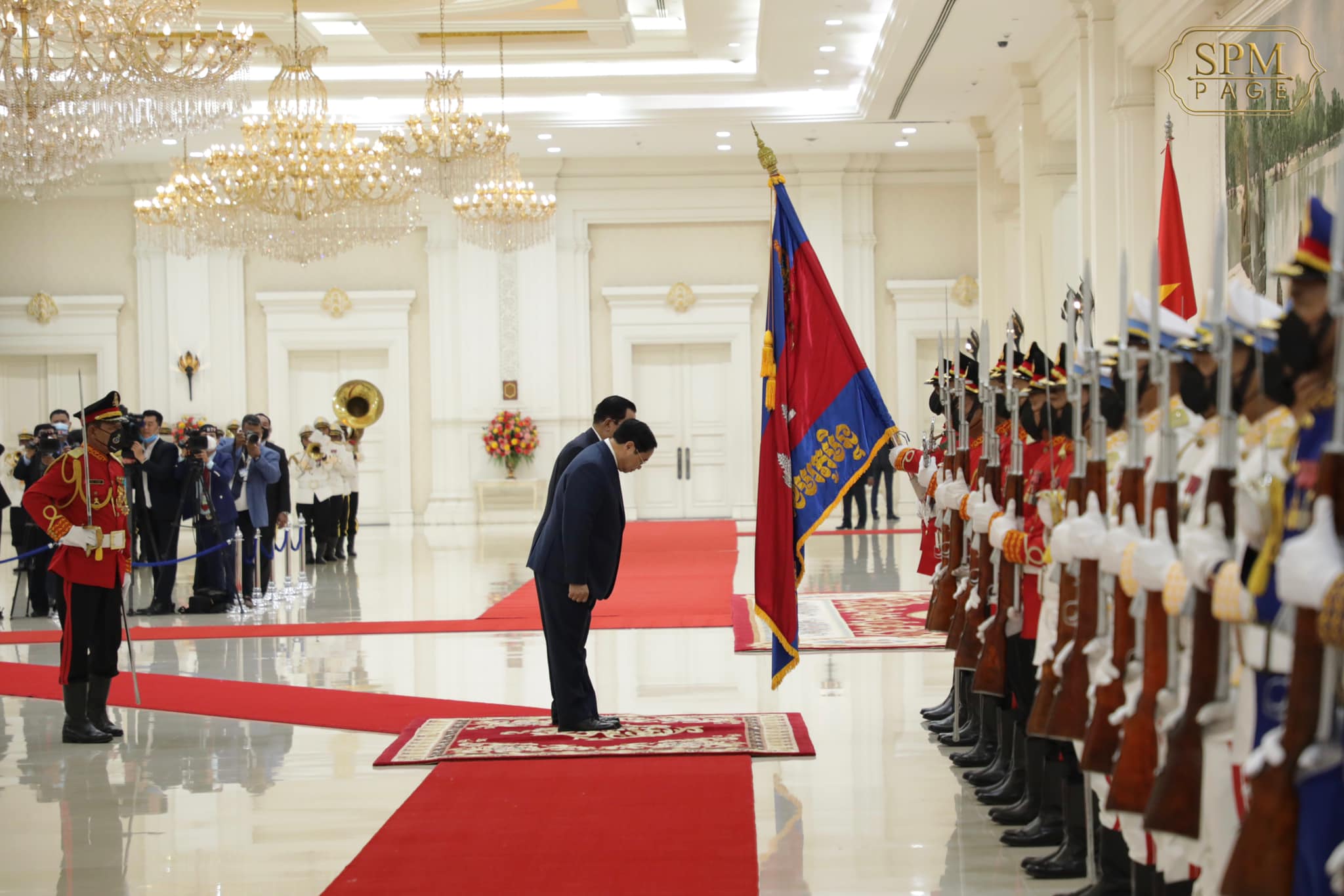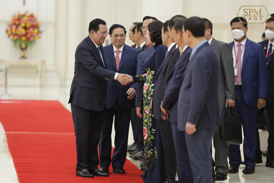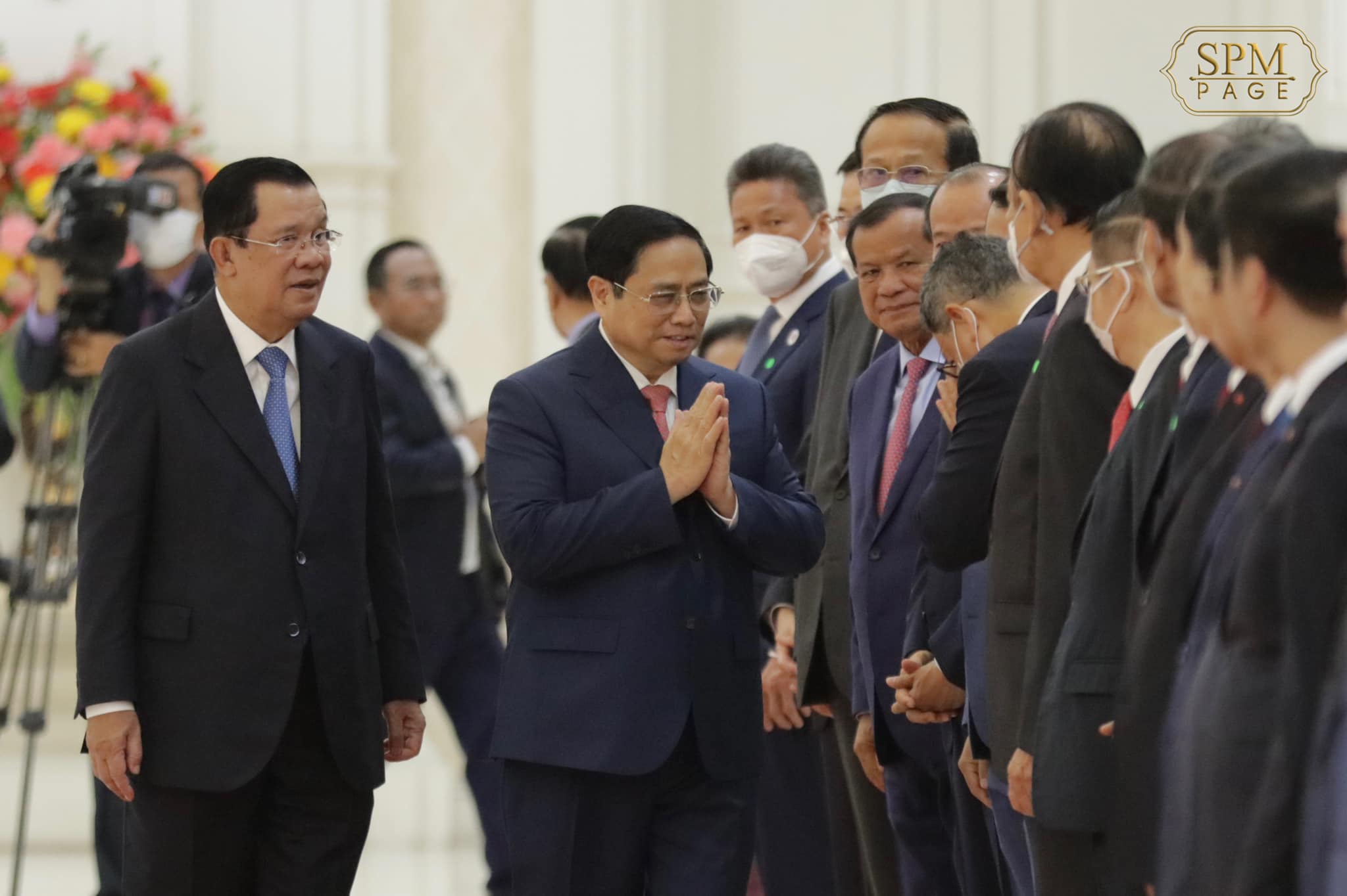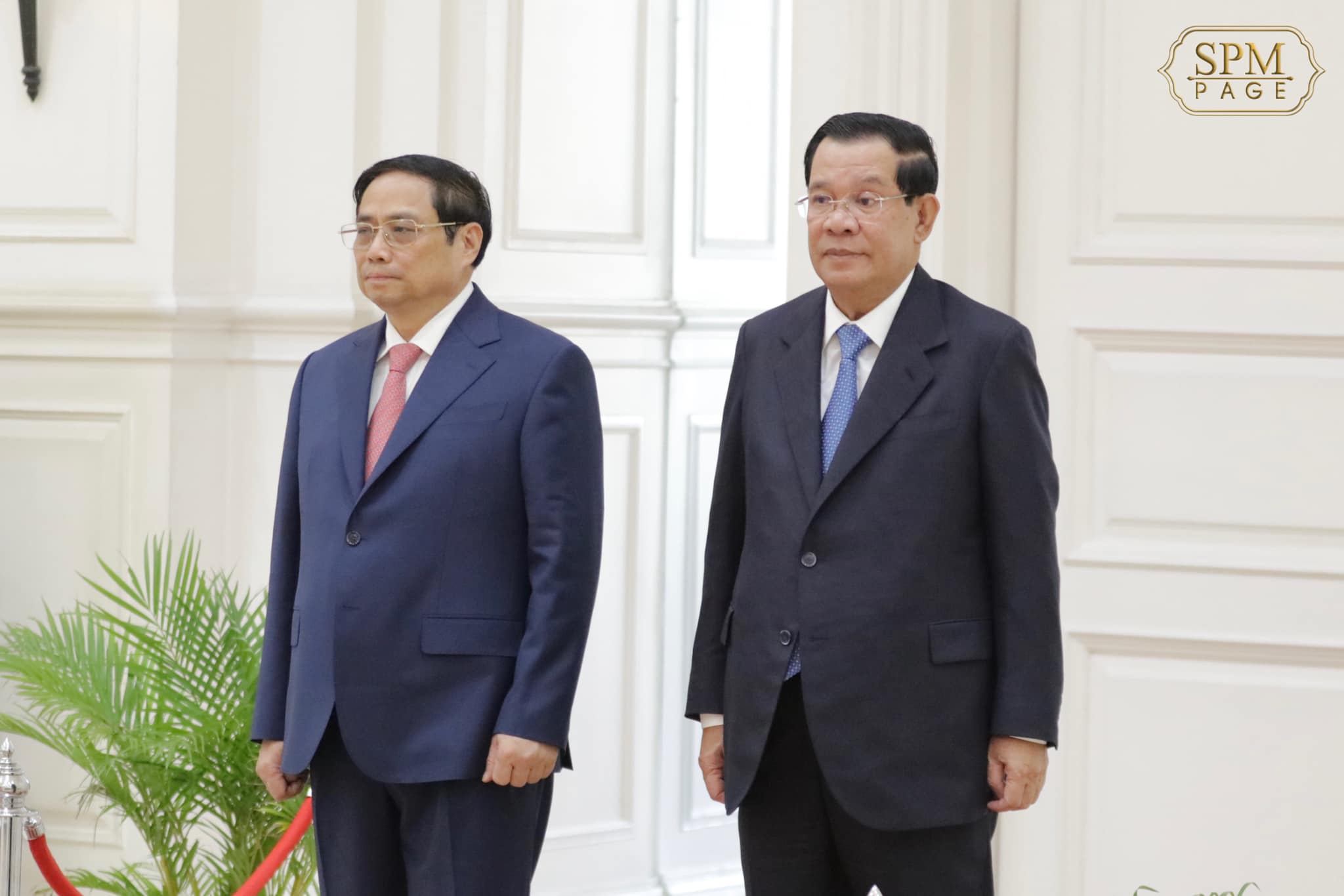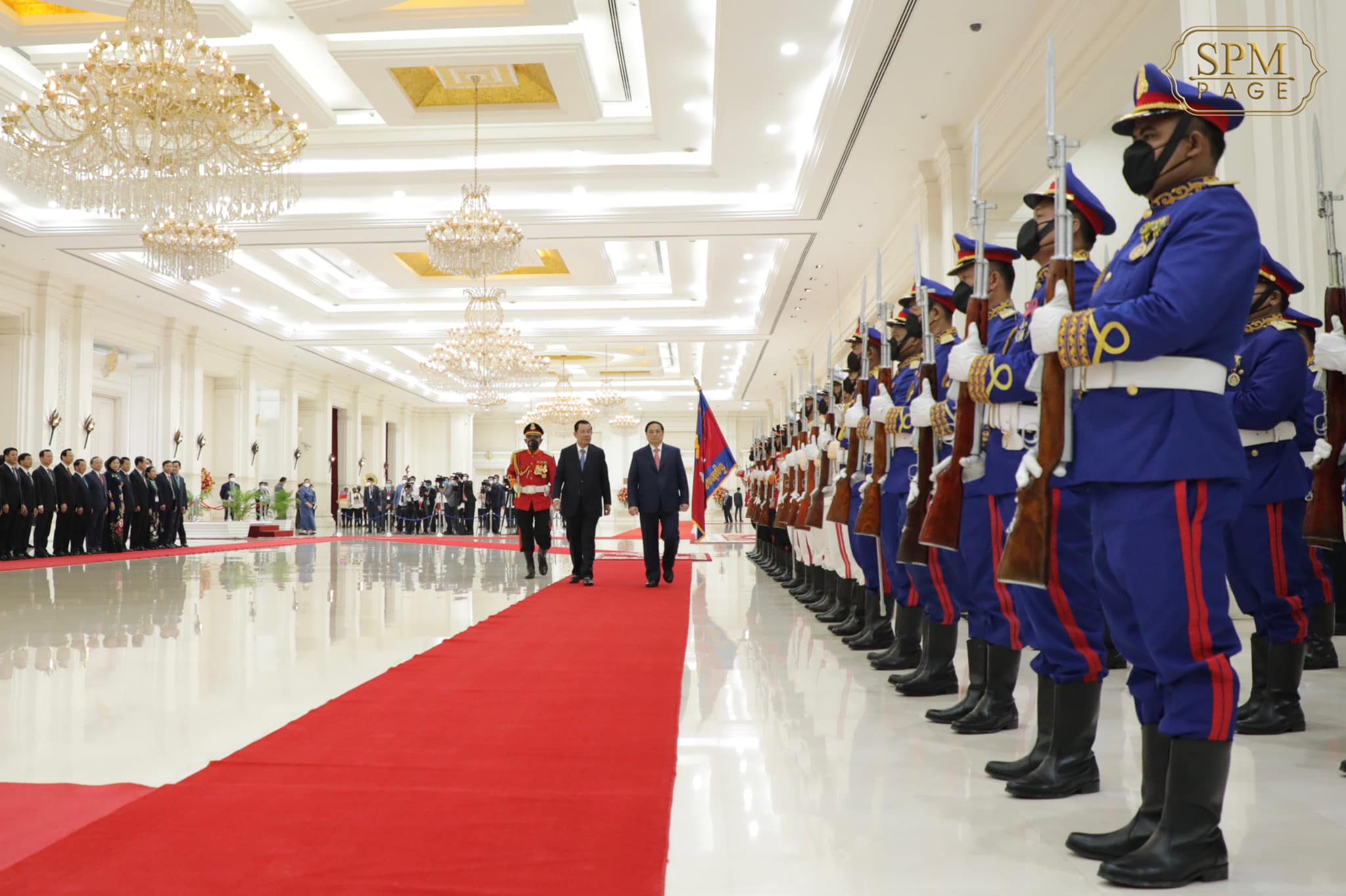 ភ្នំពេញ៖ នាព្រឹកថ្ងៃទី៨ ខែវិច្ឆិកា ឆ្នាំ២០២២នេះ សម្ដេចអគ្គមហាសេនាបតីតេជោ ហ៊ុន សែន នាយករដ្ឋមន្ត្រី នៃព្រះរាជាណាចក្រកម្ពុជា បានអញ្ជើញទទួលស្វាគមន៍ចំពោះឯកឧត្តម ផាម មិញជិញ (Pham Minh Chinh) នាយករដ្ឋមន្ត្រី នៃសាធារណរដ្ឋសង្គមនិយមវៀតណាម ក្នុងឱកាសដែលឯកឧត្តមអញ្ជើញបំពេញទស្សនកិច្ចផ្លូវការនៅកម្ពុជារយៈពេល២ថ្ងៃ។