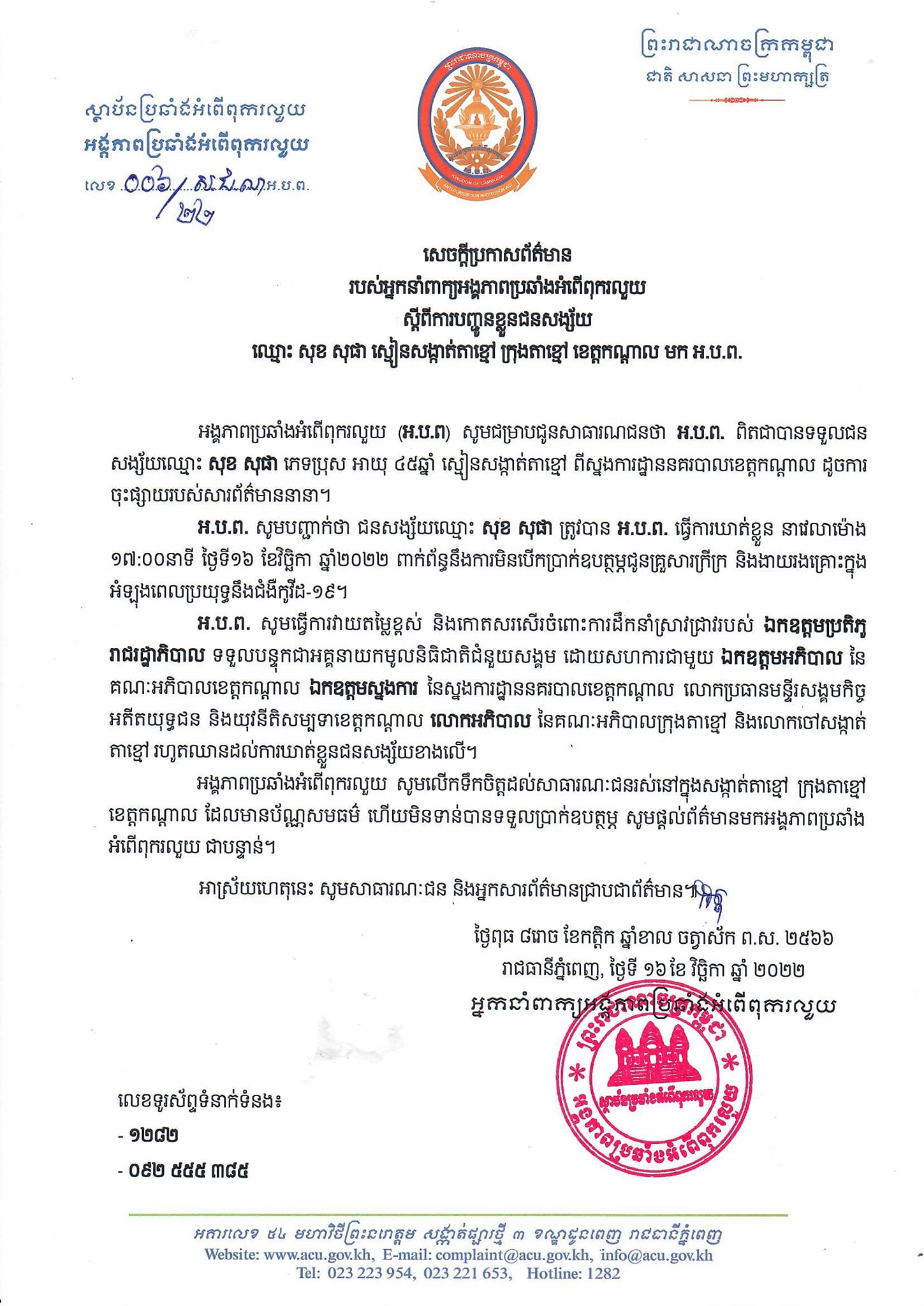 សេចក្តីប្រកាសព័ត៌មាន របស់អ្នកនាំពាក្យអង្គភាពប្រឆាំងអំពើពុករលួយ ស្តីពីការបញ្ជូនខ្លួនជនសង្ស័យ ឈ្មោះ សុខ សុផា ស្មៀនសង្កាត់តាខ្មៅ ក្រុងតាខ្មៅ ខេត្តកណ្តាល មក អ.ប.ព ៖
