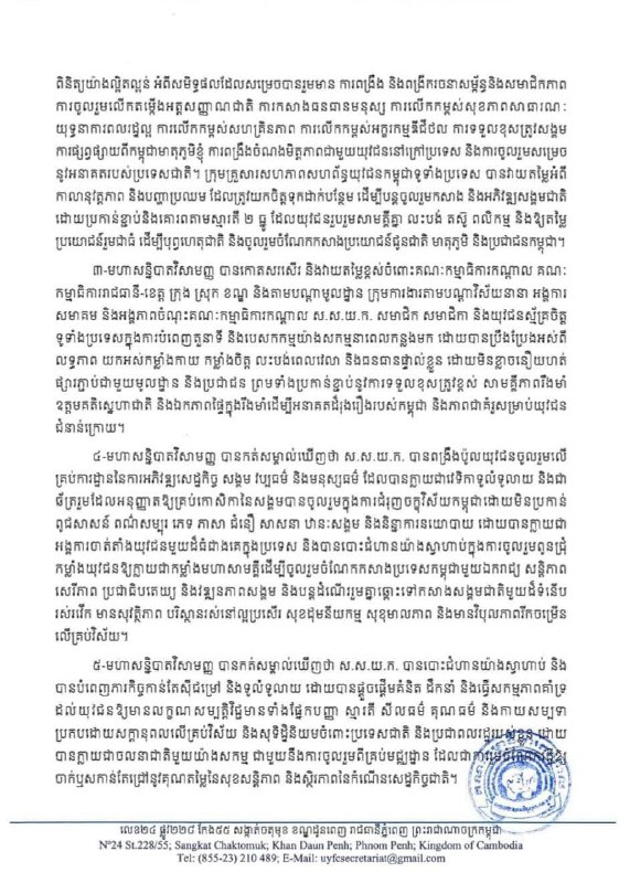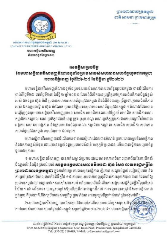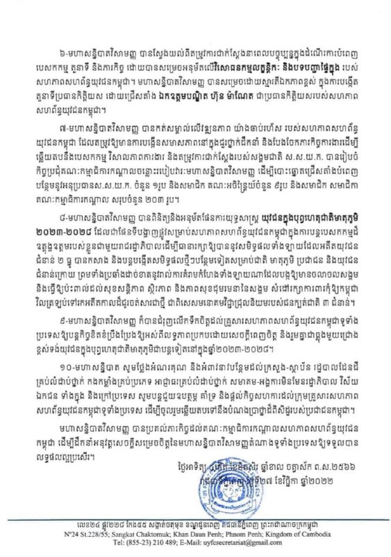 សូមជម្រាបជូនថា រយៈពេល ០២ ថ្ងៃនេះ មហាសន្និបាតបានពិនិត្យ ពិភាក្សា និង អនុម័ត លើការងារសំខាន់ៗមួយចំនួនរបស់ដូចជា ការពិនិត្យ របាយការណ៍សកម្មភាពការងារសម្រេចបាន ឆ្នាំ២០១៨-២០២៣ ពិនិត្យ ពិភាក្សា និងអនុម័ត ផែនការយុទ្ធសាស្រ្ត «យុវជនក្នុងបុព្វហេតុជាតិ មាតុភូមិ ២០២៣ ២០២៨» និងបានអនុម័តលើវិសោធនកម្មលក្ខន្តិកៈ និងបទបញ្ជាផ្ទៃក្នុងរបស់ខ្លួន។ ជាមួយគ្នានោះ កិច្ចប្រជុំគណៈកម្មាធិការកណ្តាលដែលបានប្រជុំក្នុងថ្ងៃជាមួយគ្នា បានបោះឆ្នោតជ្រើសតាំង ឯកឧត្តមបណ្ឌិត ហ៊ុន ម៉ាណែតជាប្រធានកិត្តិយស ស.ស.យ.ក. ឯកឧត្តម ទៀ សីហា ជាអនុប្រធាន ស.ស.យ.ក. ក៏ដូចជាបំពេញបន្ថែមសមាសភាព សមាជិកគណៈអចិន្រ្តៃយ៍ ចំនួន ៩រូប និងគណៈកម្មាធិការកណ្តាល ២០៣ រូបផងដែរ៕