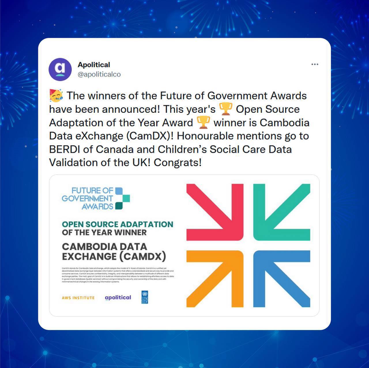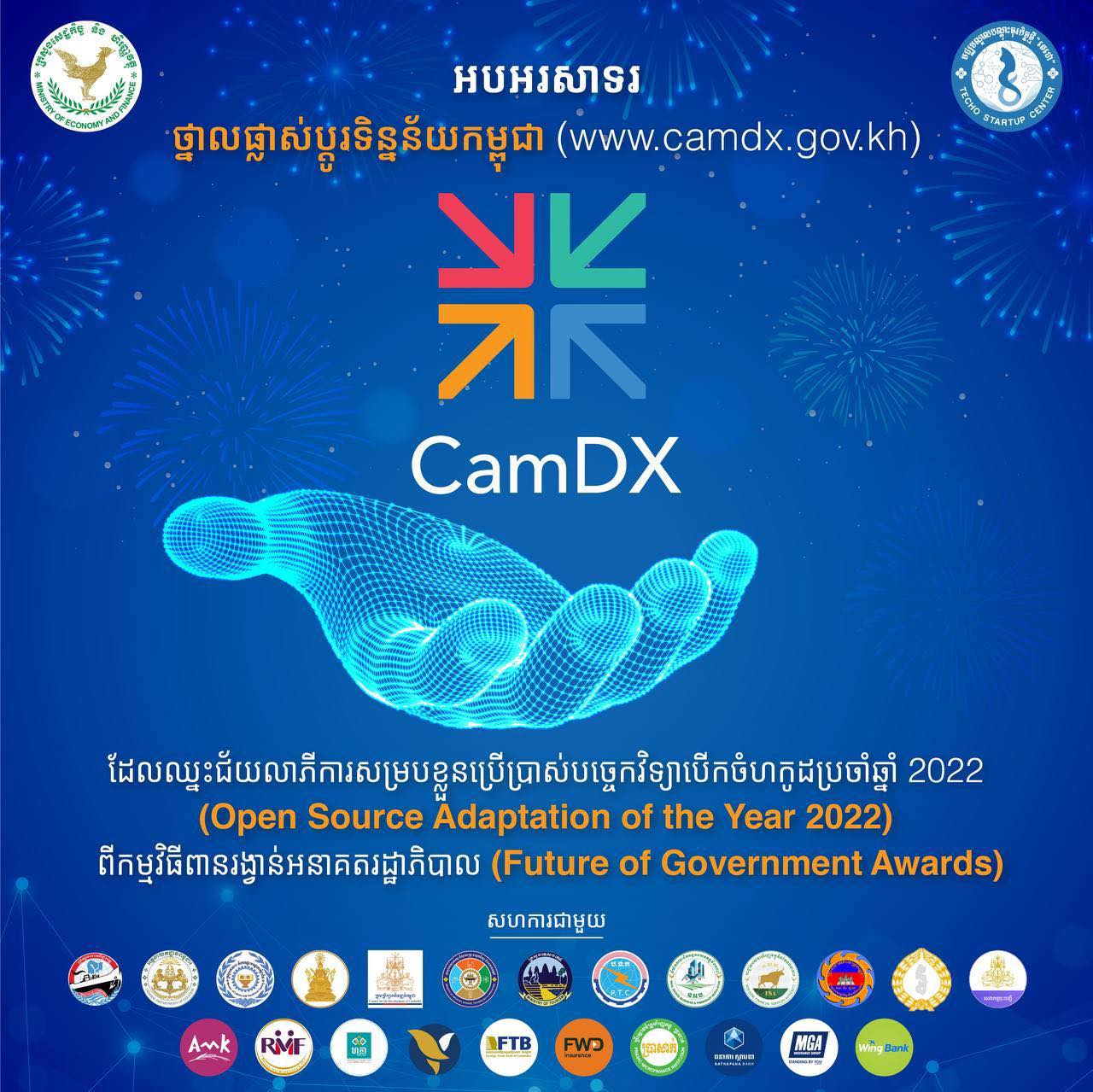 ភ្នំពេញ៖ សម្តេចតេជោ ហ៊ុន សែន នាយករដ្ឋមន្ត្រីនៃកម្ពុជា នៅថ្ងៃទី៥ ខែធ្នូ ឆ្នាំ២០២២នេះ តាមរយៈ Facebook ផ្លូវការបានចូលរួមអបអរជាមួយក្រសួងសេដ្ឋកិច្ច និងហិរញ្ញវត្ថុ រួមនឹងក្រសួង-ស្ថាប័នពាក់ព័ន្ធទាំងអស់ដែល «ថ្នាលផ្លាស់ប្តូរទិន្នន័យកម្ពុជា» (Cambodia Data eXchange ហៅកាត់ថា CamDX) ត្រូវបានប្រកាសទទួលជ័យលាភី Open Source Adaptation of the Year ពីកម្មវិធីពានរង្វាន់អនាគតរដ្ឋាភិបាល (Future of Government Awards ) ដែលបានសហការគាំទ្រដោយអង្គការកម្មវិធីអភិវឌ្ឍន៍សហប្រជាជាតិ (UNDP), Amazon Web Service Institute នៃក្រុមហ៊ុនអន្តរជាតិអាម៉ាហ្សូន និងបណ្តាញសាកលសម្រាប់រដ្ឋាភិបាល Apolitical ដែលមានគម្រោងចូលរួមប្រកួតប្រជែងចំនួន១៥០ និងមកពី៥២ប្រទេស សម្រាប់កម្មវិធីទាំងមូល។
