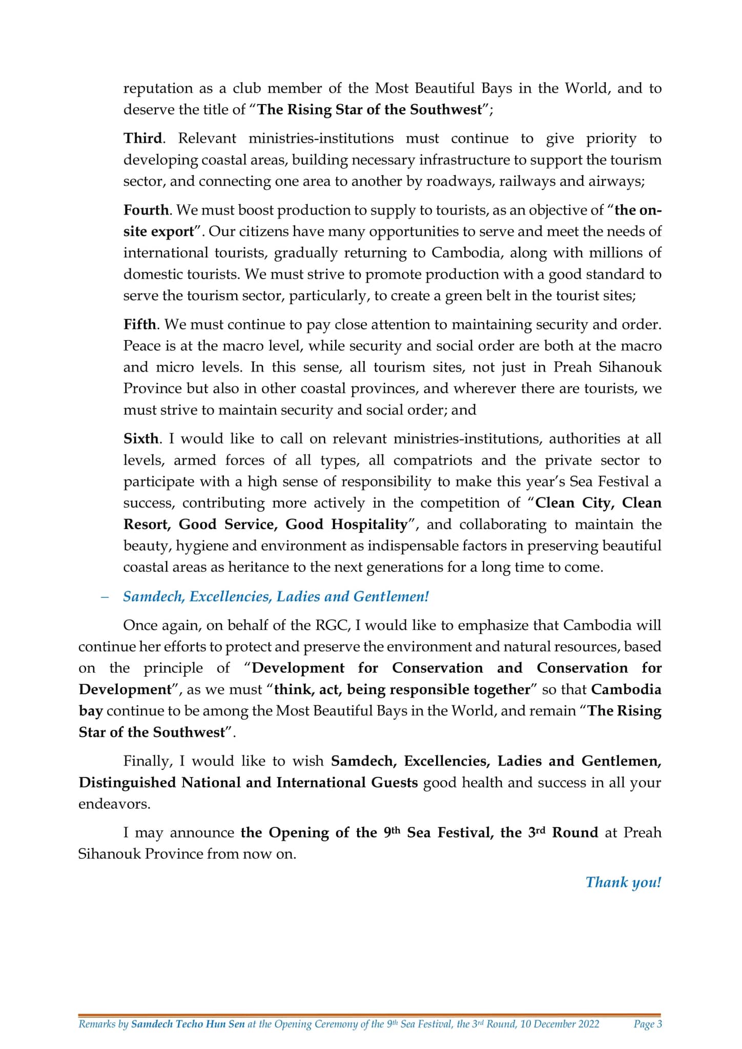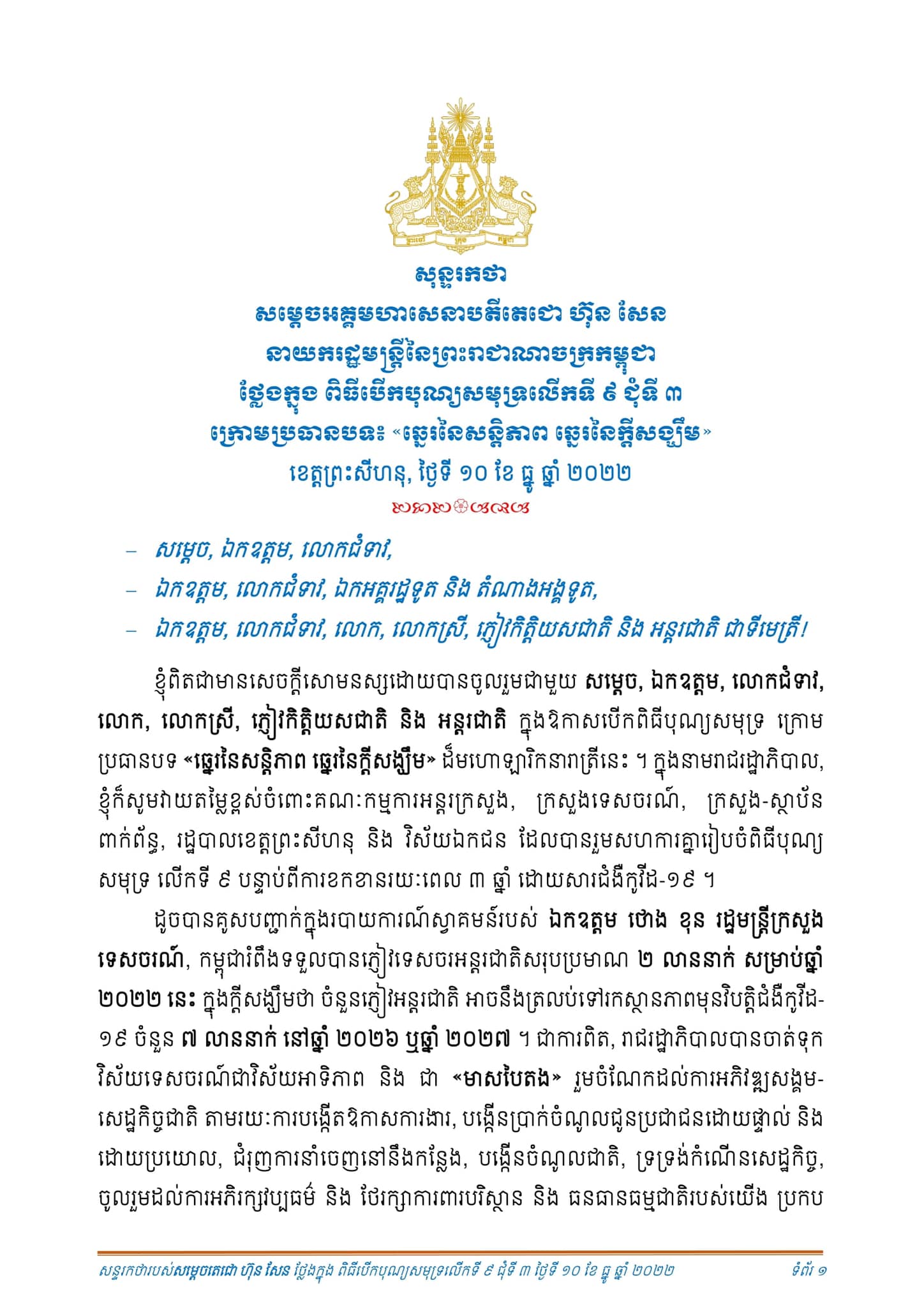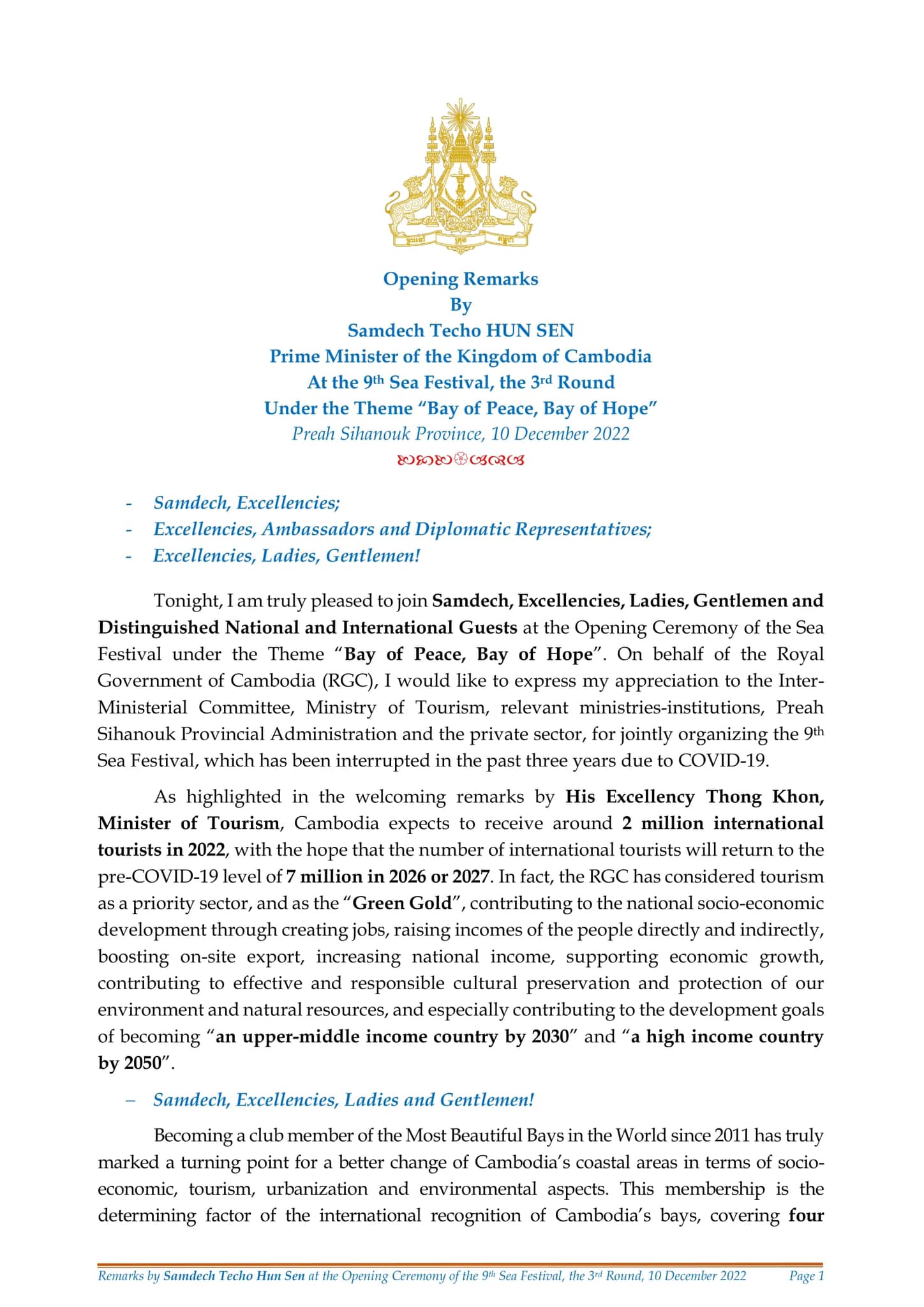 នៅក្នុងឱកាសនៃពិធីបើកបុណ្យសមុទ្រនេះផងដែរ សម្ដេចតេជោនាយករដ្ឋមន្ត្រី បានអញ្ជើញថ្លែងសុន្ទរកថា និងអនុសាសន៍សំខាន់ៗ ដូចមានភ្ជាប់ជាមួយរូបភាពពិធីបើក ខាងក្រោម៖