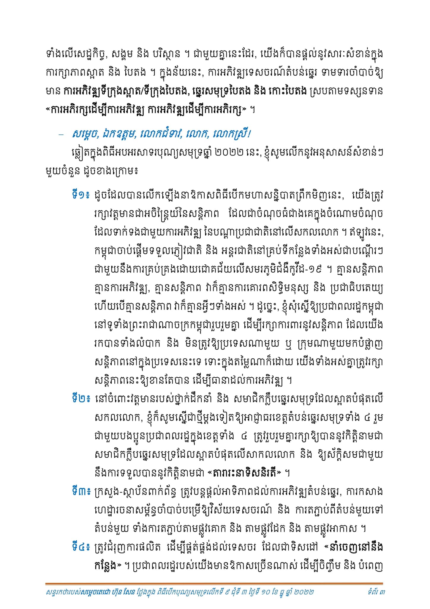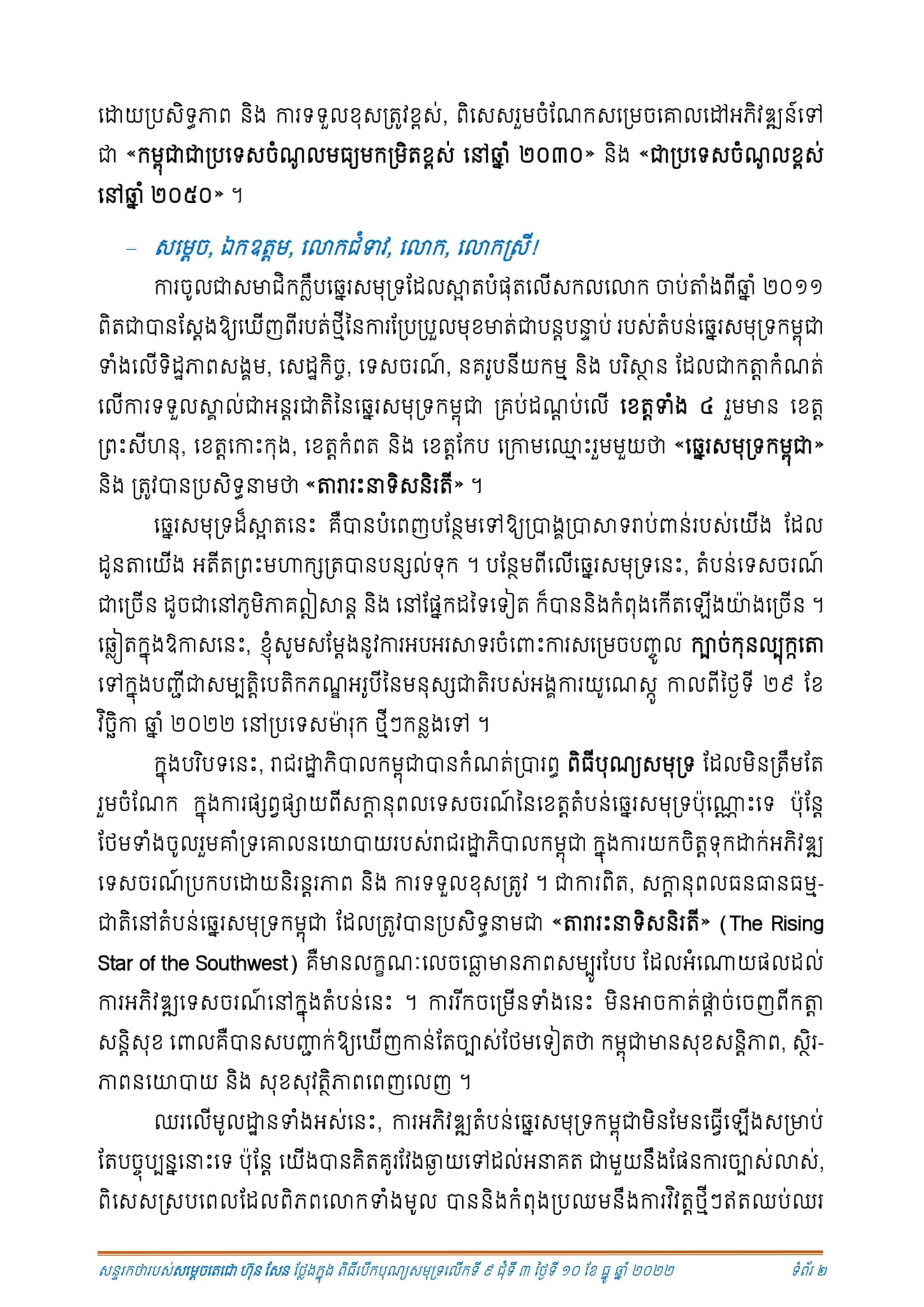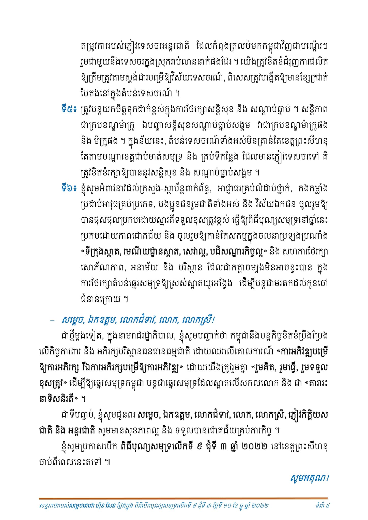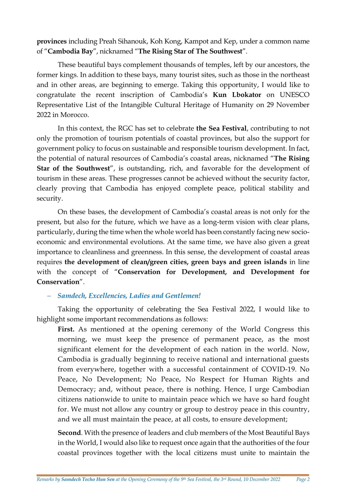 នៅក្នុងឱកាសនៃពិធីបើកបុណ្យសមុទ្រនេះផងដែរ សម្ដេចតេជោនាយករដ្ឋមន្ត្រី បានអញ្ជើញថ្លែងសុន្ទរកថា និងអនុសាសន៍សំខាន់ៗ ដូចមានភ្ជាប់ជាមួយរូបភាពពិធីបើក ខាងក្រោម៖
