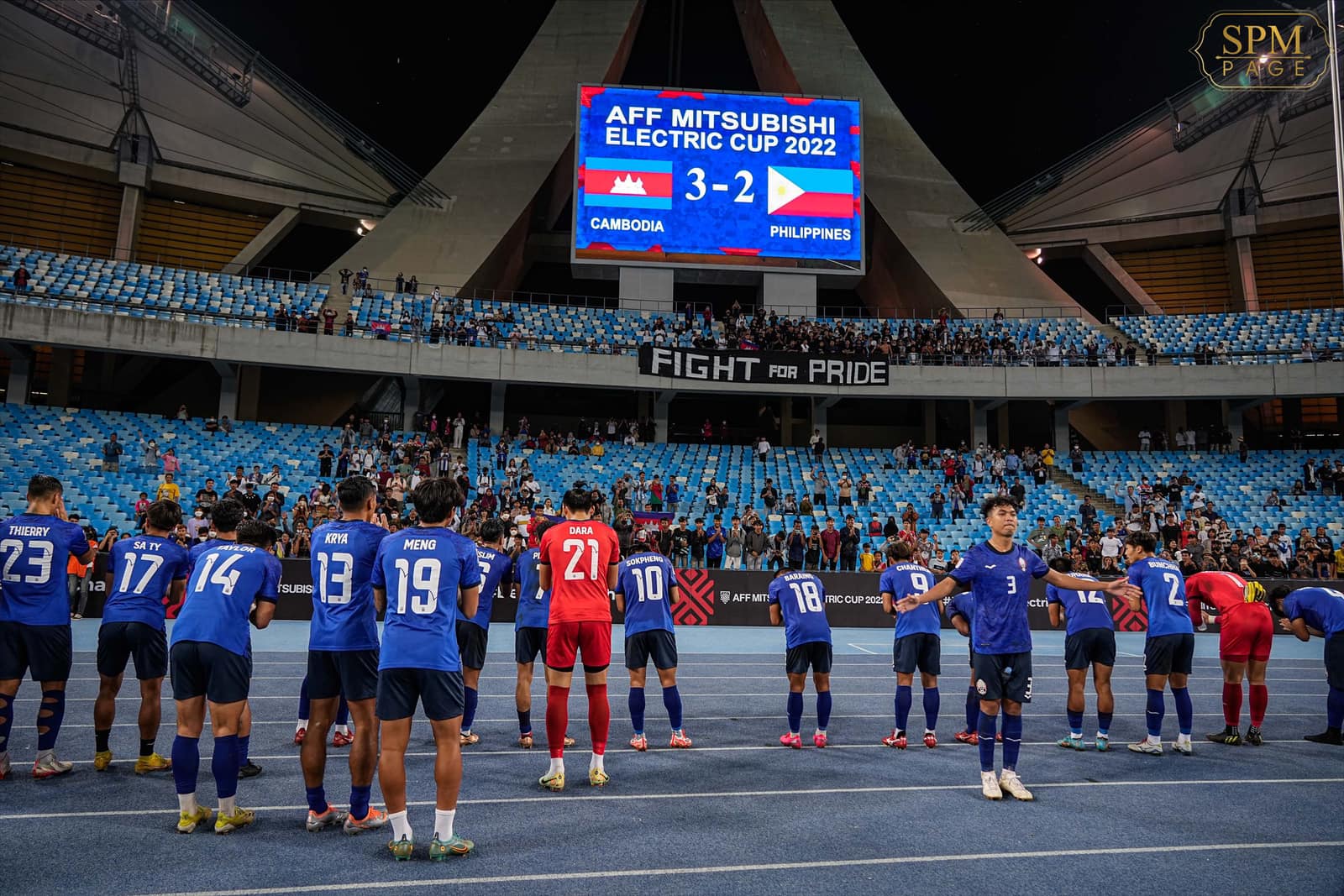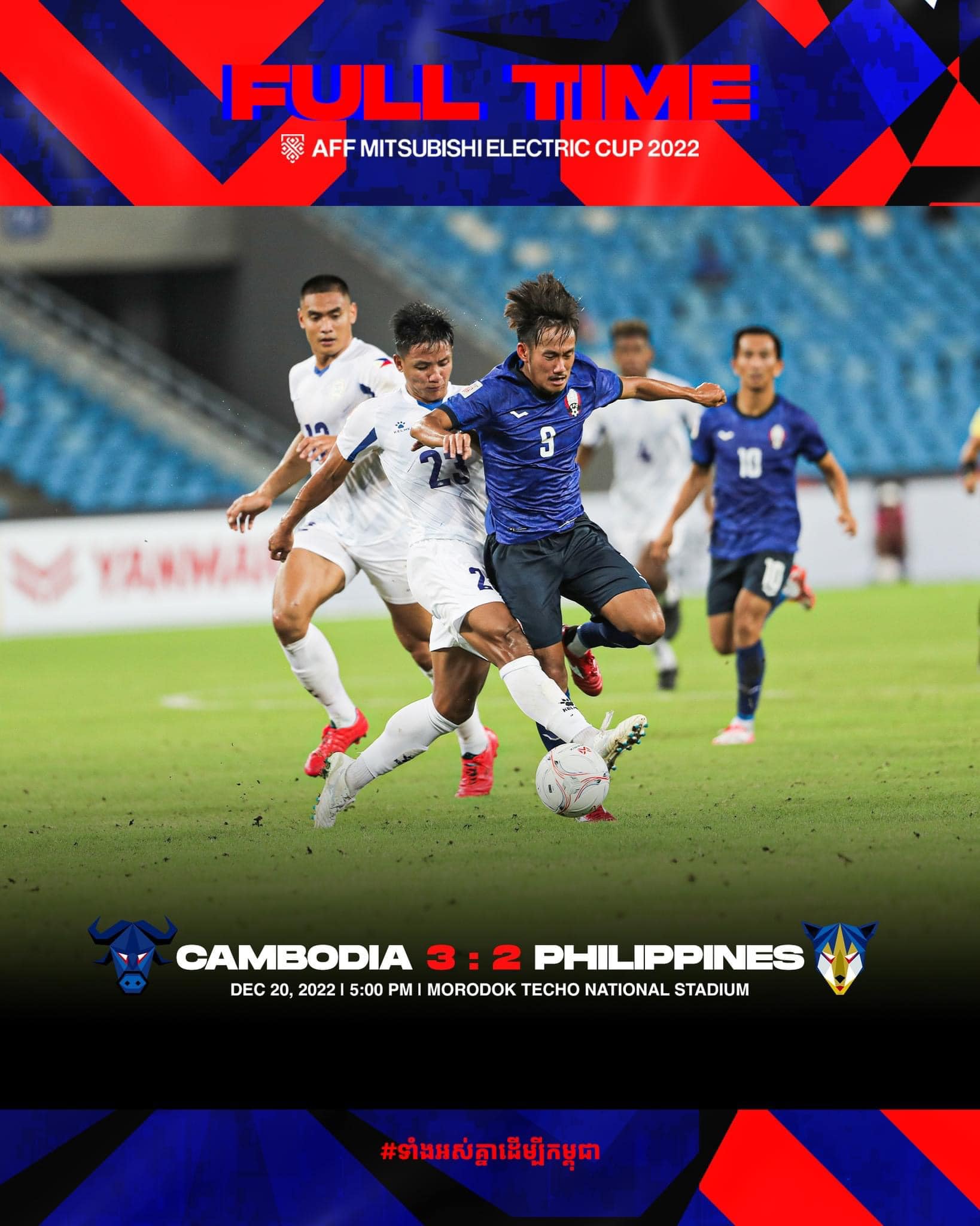 អបអរសាទរ ក្រុមជម្រើសជាតិកម្ពុជា រកបាន ៣ពិន្ទុពេញ ពីការប្រកួតបើកឆាកពានរង្វាន់ AFF Mitsubishi Electric Cup 2022 ពូល A ក្រោយយកឈ្នះក្រុមជម្រើសជាតិហ្វីលីពីន ៣-២ មុននេះបន្ដិច នៅពហុកីឡដ្ឋានជាតិមរតកតេជោ ។