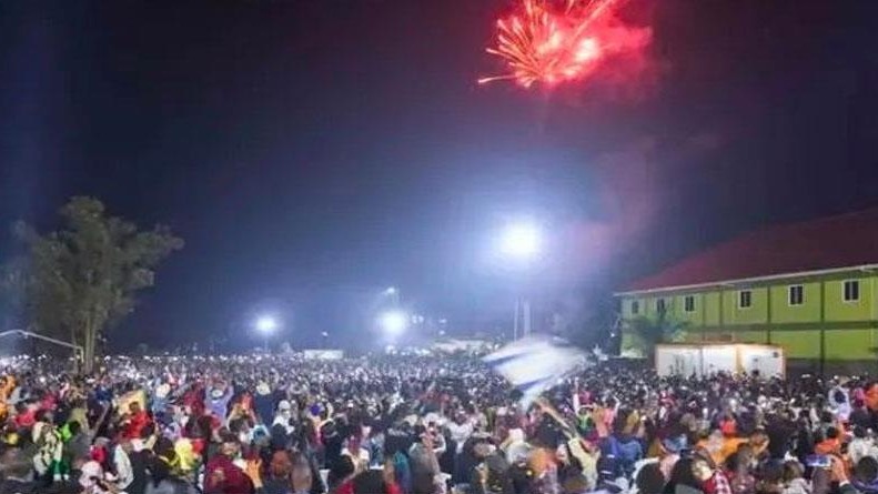 មនុស្សម្នាបានប្រារព្ធពិធីចូលឆ្នាំថ្មីនៅផ្សារទំនើបខាងលើ ដែលស្ថិតនៅលើផ្លូវហាយវ៉េតភ្ជាប់អាកាសយានដ្ឋានអន្តរជាតិ Entebbe និងទីក្រុងកាំប៉ាឡា។