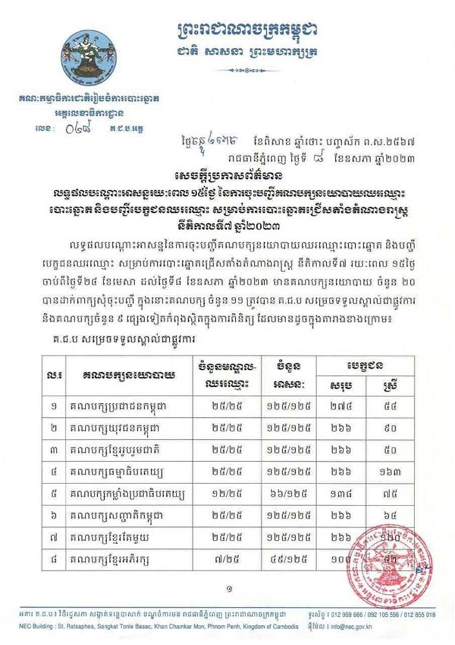 សូមអានទាំងស្រុងនូវសេចក្តីប្រកាសពត៌មានរបស់គណៈកម្មាធិការជាតិរៀបចំការបោះឆ្នោតស្តីពីលទ្ធផលបណ្តោះអាសន្នរយៈពេល១៥ថ្ងៃ នៃការចុះបញ្ជីគណបក្សនយោបាយឈរឈ្មោះបោះឆ្នោតនិងបញ្ជីបេក្ខជនឈរឈ្មោះ សម្រាប់ការបោះឆ្នោតជ្រើសតាំងតំណាងរាស្ត្រនិតិកាលទី៧ ឆ្នាំ២០២៣ ៖