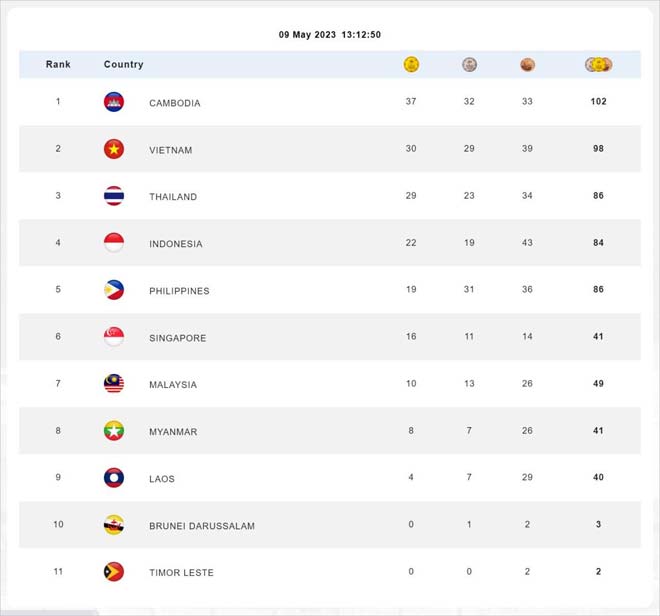 រាជធានីភ្នំពេញ ៖ យោងតាមលទ្ធផលផ្លូវការរបស់ SeaGames 2023 បង្ហាញឲ្យដឹងថា គិតត្រឹមម៉ោង១៖១២នាទីរសៀល ថ្ងៃទី៩ ខែឧសភា ឆ្នាំ២០២៣នេះ កម្ពុជាបន្ដឈរលើកំពូលតារាង មានមេដាយច្រើនជាងគេចំនួន ១០២គ្រឿង ក្នុងនោះមេដាយមាស ៣៧គ្រឿង, មេដាយប្រាក់ចំនួន ៣២គ្រឿង និងមេដាយសំរិទ្ធចំនួន ៣៣គ្រឿង៕