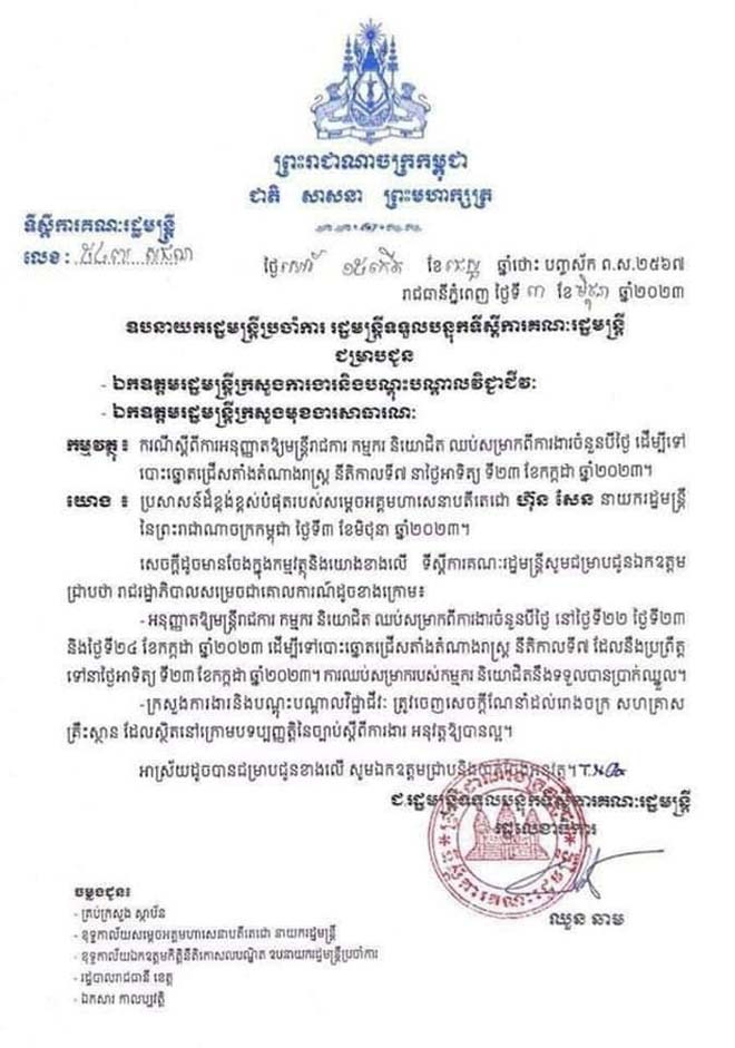 រាជធានីភ្នំពេញ ៖ រាជរដ្ឋាភិបាលបានអនុញ្ញាតឱ្យមន្ត្រីរាជការ កម្មករកម្មការិនី និយោជិត ឈប់សម្រាករយៈពេល៣ថ្ងៃ (ថ្ងៃទី២២- ២៣ -២៤ ខែកក្កដា ឆ្នាំ២០២៣) ដើម្បីទៅចូលរួមបោះឆ្នោតជ្រើសតាំងតំណាងរាស្រ្ដនាថ្ងៃទី២៣ ខែកក្កដា ឆ្នាំ២០២៣ខាងមុខ៕