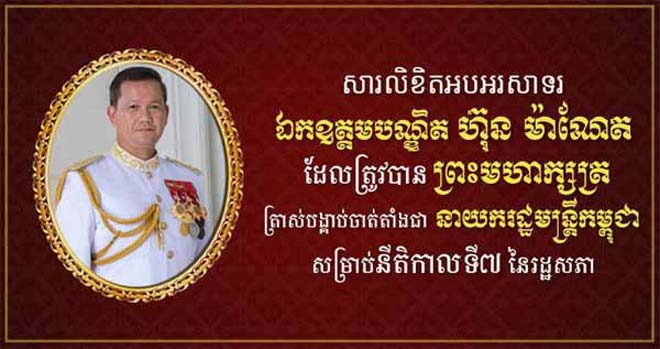 លោក មាស ចន្ទ័រិទ្ធ ចាងហ្វាង គេហទំព័រ សន្តិភាពប៉ុស្តិ៏ ព្រមទាំងបុគ្គលិកទាំងអស់ សូមអបអរសាទរដោយស្មោះជូនចំពោះ ឯកឧត្តមបណ្ឌិត ហ៊ុន ម៉ាណែត ដែលត្រូវបាន ព្រះករុណា ព្រះបាទ សម្តេចព្រះ បរមនាថ នរោត្តម សីហមុនី ព្រះមហាក្សត្រនៃកម្ពុជា ត្រាស់បង្គាប់ចាត់តាំងជា នាយករដ្ឋមន្ត្រីនៃកម្ពុជា ដើម្បីរៀបចំរាជរដ្ឋាភិបាល អាណត្តិទី៧។