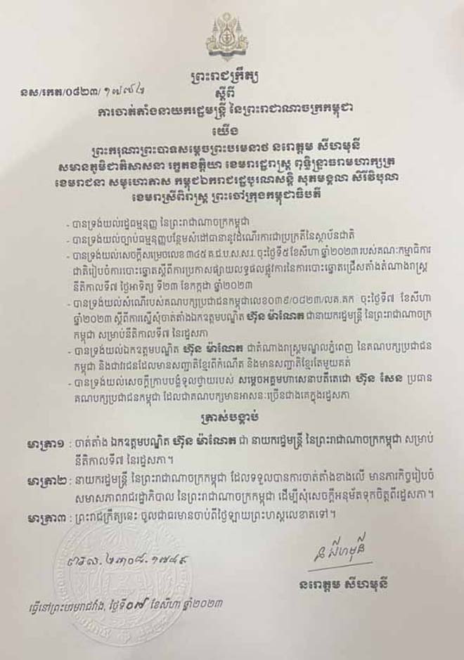 យើងខ្ញុំទាំងអស់គ្នា ជឿជាក់យ៉ាងមុតមាំថា រាជរដ្ឋាភិបាលកម្ពុជា ក្នុងអាណត្តិថ្មី ក្រោមមាគ៌ាដឹកនាំប្រកបដោយគតិបណ្ឌិតរបស់ ឯកឧត្តមបណ្ឌិត នឹងធ្វើឱ្យប្រទេសយើង បន្តទទួលបាននូវសុខសន្តិភាព ស្ថិរភាពនយោបាយ និងការអភិវឌ្ឍរីកចម្រើនទៅមុខឥតឈប់ឈរលើគ្រប់វិស័យ ស្របទៅតាមមាគ៌ា និងមរតកនយោបាយដ៏ថ្លៃថ្លារបស់គណបក្សប្រជាជនកម្ពុជា ពិសេស មាគ៌ាដឹកនាំប្រកបដោយគតិបណ្ឌិត និងភាពប៉ិនប្រសប់របស់ សម្តេចតេជោ ហ៊ុន សែន ប្រធានគណបក្សប្រជាជនកម្ពុជា ដែលធ្វើឱ្យជាតិមាតុភូមិមានភាពសម្បូរសប្បាយ ប្រជាពលរដ្ឋរស់នៅប្រកបដោយសុភមង្គល និងវិបុលភាព ព្រមទាំងទទួលបាននូវកិត្យានុភាពល្បីល្បាញទាំងក្នុងតំបន់ និងសកលលោក។