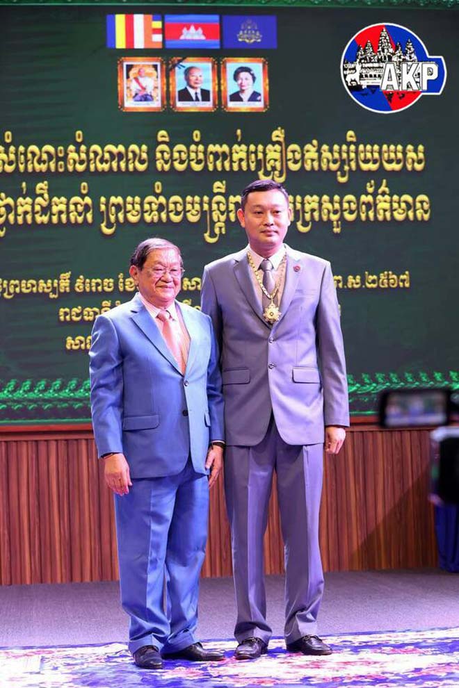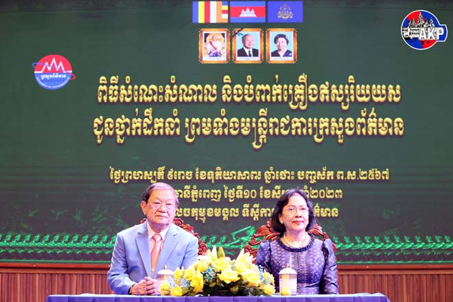 រាជធានីភ្នំពេញ ៖ ឯកឧត្តម ខៀវ កាញារីទ្ធ រដ្ឋមន្ត្រីក្រសួងព័ត៌មាន និងលោកជំទាវ ខៀវទេព រង្ស៊ីកាញារីទ្ធ ប្រធានកិតិ្តយសសមាគមនារីដើម្បីសន្តិភាព និងអភិវឌ្ឍន៍ សាខាក្រសួងព័ត៌មាន អញ្ជើញជាអធិបតី ពិធីសំណេះសំណាល ថ្លែងអំណរគុណ និងបំពាក់គ្រឿងឥស្សរិយយស ជូនថ្នាក់ដឹកនាំ និងមន្រ្តីរាជការក្រសួងព័ត៌មាន នាព្រឹកថ្ងៃទី១០ ខែសីហា ឆ្នាំ២០២៣ នៅក្រសួងព័ត៌មាន រាជធានីភ្នំពេញ។ប្រភពអាកាប៉េ