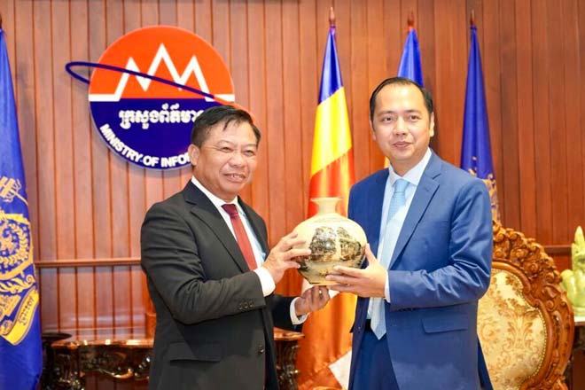 រាជធានីភ្នំពេញ ៖ ក្នុងជំនួបពិភាក្សាការងាររវាង ឯកឧត្តម នេត្រ ភក្ត្រា រដ្ឋមន្ត្រីក្រសួងព័ត៌មាន និង ឯកឧត្តម ង្វៀន ហ៊ុយតាំង (Nguyen Huy Tang ) អគ្គរដ្ឋទូតសាធារណរដ្ឋសង្គមនិយមវៀតណាមប្រចាំនៅកម្ពុជា នាព្រឹកថ្ងៃទី១៨ ខែតុលា ឆ្នាំ២០២៣ បានផ្តោតជាសំខាន់ក្នុងការពង្រឹងកិច្ចសហប្រតិបតិ្តការគ្រប់ជ្រុងជ្រោយ ដើម្បីរួមគ្នាទប់ស្កាត់ និងលុបបំបាត់ព័ត៌មានក្លែងក្លាយ ដោយមិនត្រូវអោយព័ត៌មានក្លែងក្លាយនេះដឹកមុខយើងយូរនោះទេ នាំអោយកើតមានបញ្ហាកាន់តែច្រើន ធ្វើអោយប៉ះពាល់ដល់ចំណងមិត្តភាព និងកិច្ចសហប្រតិបត្តិការរវាងប្រទេសទាំងពីរ កម្ពុជា វៀតណាម ។