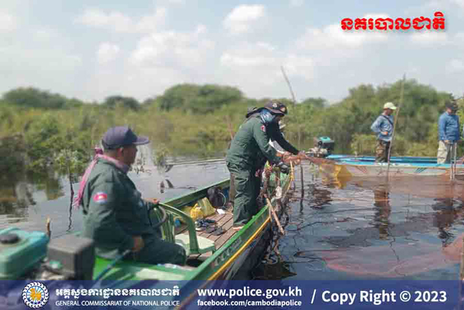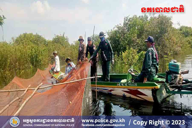 ខេត្តបាត់ដំបង ៖ នៅថ្ងៃទី២០ ខែតុលា ឆ្នាំ២០២៣ កម្លាំងអធិការដ្ឋាននគរបាលស្រុកសង្កែ សហការជាមួយរដ្ឋបាលស្រុកសង្កែ ដឹកនាំដោយលោកវរសេនីយ៍ទោ យុត តុងហូ ជាអធិការនគរបាលស្រុកសង្កែ បានចុះបង្រ្កាបបទល្មើសជលផល ០១លើក នៅចំណុចឃុំកំពង់ព្រះ និងកំពង់ព្រៀង ស្រុកសង្កែ ខេត្តបាត់ដំបង មានចូលរួមកម្លាំងចំរុះសរុបចំនួន ១៧នាក់ ។ សមត្ថកិច្ចបានប្រើប្រាស់សម្ភារៈក្នុងកិច្ចប្រតិបត្តិការនេះរួមមាន កាណូតចំនួន ០៤គ្រឿង ។