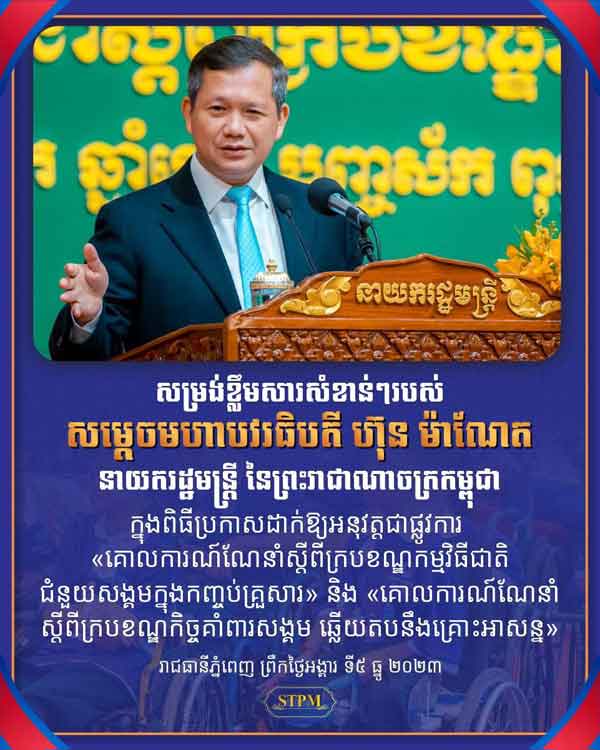 រាជធានីភ្នំពេញ ៖ នាថ្ងៃទី៥ ខែធ្នូ ឆ្នាំ២០២៣ នៅសណ្ឋាគារសុខាភ្នំពេញ, សម្តេចមហាបវរធិបតី ហ៊ុន ម៉ាណែត នាយករដ្ឋមន្ត្រី នៃព្រះរាជាណាចក្រកម្ពុជា បានអញ្ជើញជាអធិបតីដ៏ខ្ពង់ខ្ពស់ក្នុងពិធីប្រកាសដាក់ឱ្យអនុវត្តជាផ្លូវការ «គោលការណ៍ណែនាំស្តីពីក្របខ័ណ្ឌកម្មវិធីជាតិជំនួយសង្គមក្នុងកញ្ចប់គ្រួសារ» និង «គោលការណ៍ណែនាំស្តីពីក្របខ័ណ្ឌកិច្ចគាំពារសង្គមឆ្លើយតបនឹងគ្រោះអាសន្ន» ដែលជាឯកសារដ៏សំខាន់ចំនួនពីរ ក្រោមកម្មវិធីគោលនយោបាយអាទិភាពទី៣ គឺ «ការធ្វើស្ថាបនូបនីយកម្មកម្មវិធីជាតិជំនួយសង្គមសម្រាប់គ្រួសារក្រីក្រ ក្រុមជនងាយរងគ្រោះនៅក្នុងគ្រួសារក្រីក្រ និងគ្រួសារងាយរងហានិភ័យនៅក្នុងគ្រាមានវិបត្តិសេដ្ឋកិច្ច និងគ្រាមានអាសន្ន» ក្នុងចំណោមកម្មវិធីគោលនយោបាយអាទិភាពទាំង ៦ របស់រាជរដ្ឋាភិបាល នីតិកាលទី៧ នៃរដ្ឋសភា នេះ ។
