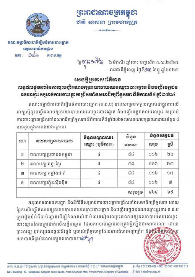 រាជធានីភ្នំពេញ ៖ លទ្ធផលផ្លូវការ នៃការចុះបញ្ជី គណបក្សនយោបាយ ឈរឈ្មោះបោះឆ្នោត និងបញ្ជីបេក្ខជន ឈរឈ្មោះ សម្រាប់ ការបោះឆ្នោត ជ្រើសតាំងសមាជិកព្រឹទ្ធសភា នីតិកាលទី៥ ឆ្នាំ២០២៤