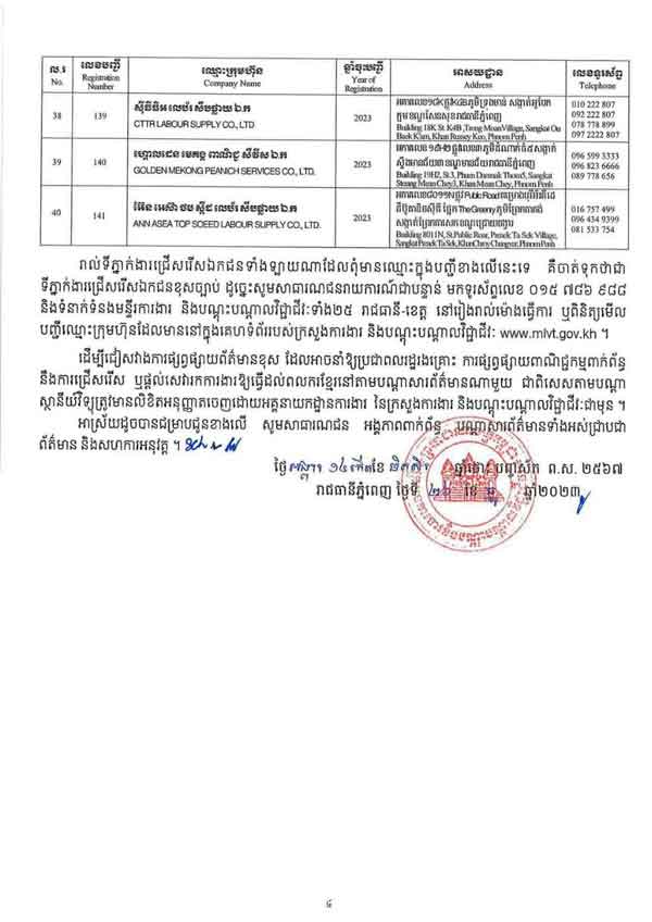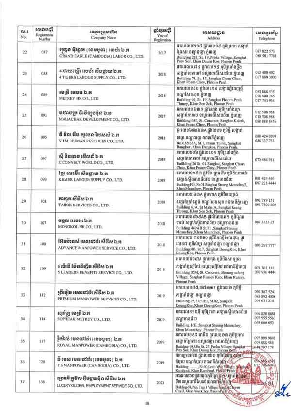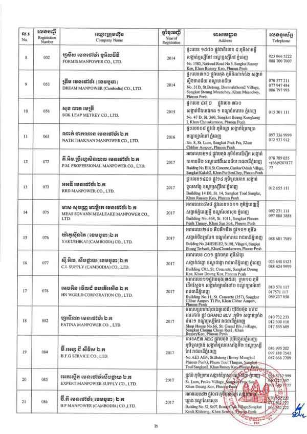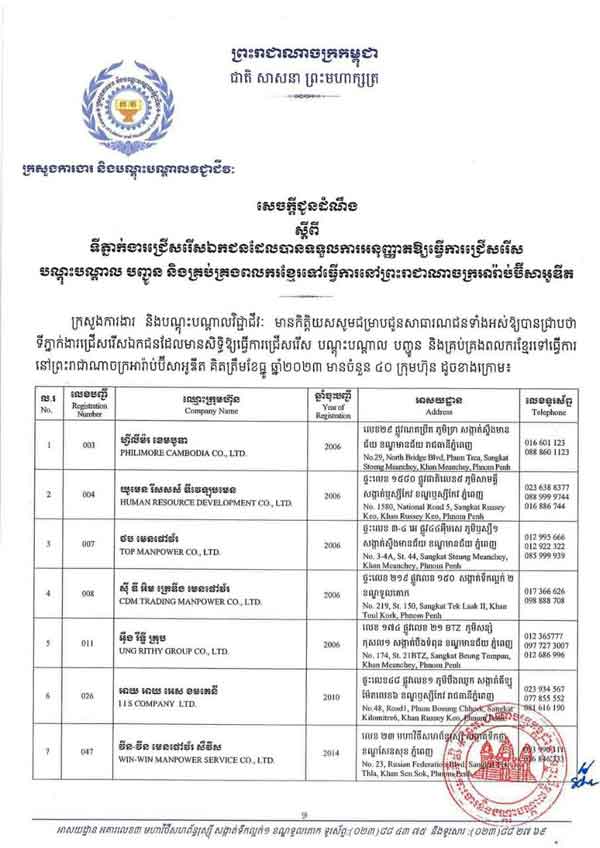 រាជធានីភ្នំពេញ ៖ ក្រសួងការងារបណ្តុះបណ្តាល និងវិជ្ជាជីវៈ បានបង្ហាញបញ្ជីឈ្មោះក្រុមហ៊ុនស្របច្បាប់ ក្នុងការជ្រើសរើស បណ្តុះបណ្តាល បញ្ជូន និងគ្រប់គ្រងពលករទៅធ្វើកម្មសិក្សា និងធ្វើការនៅប្រទេសជប៉ុន មានដូចខាងក្រោម ៖