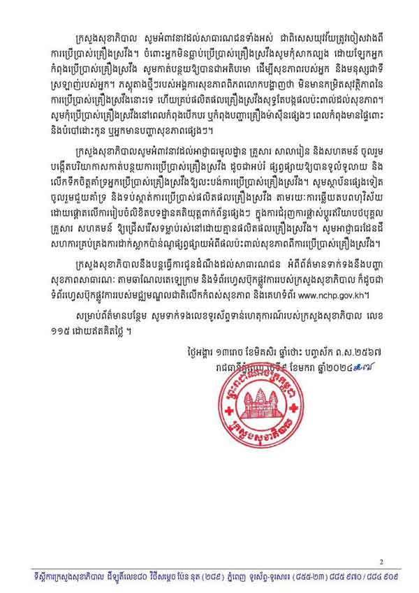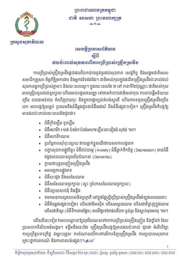 រាជធានីភ្នំពេញ ៖ នាថ្ងៃទី៩ ខែមករា ឆ្នាំ២០២៤ ក្រសួងសុខាភិបាល បានចេញសេចក្ដីប្រកាសព័ត៌មានស្ដីពីផលប៉ះពាល់សុខភាពដោយសារការប្រើប្រាស់គ្រឿងស្រវឹង ព្រោះជាតិអាល់កុលក្នុងផលិតផលគ្រឿងស្រវឹងប៉ះពាល់ដល់សុខភាពអ្នកប្រើប្រាស់ភ្លាមៗ និងរយៈពេលយូរ ក្នុងនោះអាចកើតឬឆ្លងជំងឺច្រើនជាង១០មុខ។