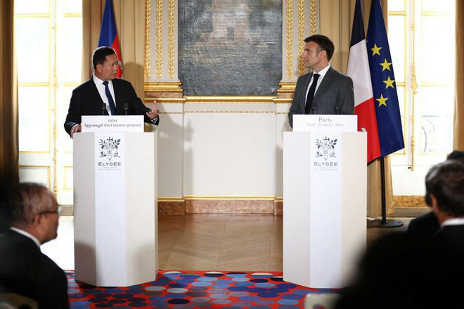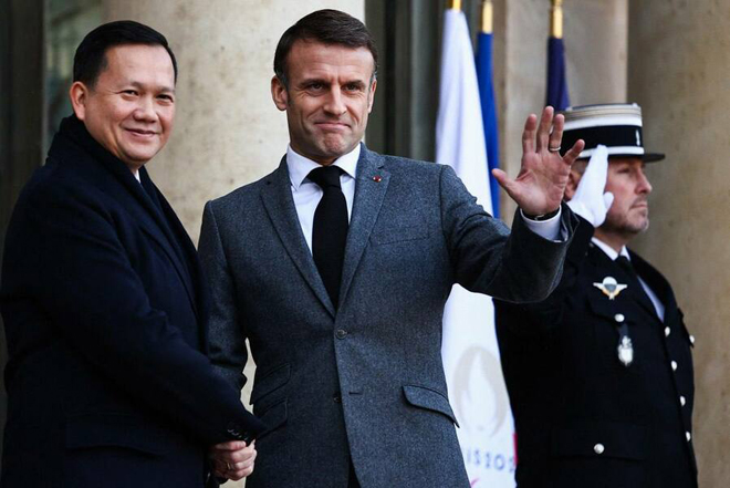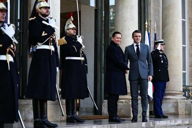 សម្តេចមហាបវរធិបតី ហ៊ុន ម៉ាណែត នាយករដ្ឋមន្រ្តី នៃព្រះរាជាណាចក្រកម្ពុជា បានចាប់ផ្តើមដំណើរបំពេញទស្សនកិច្ចផ្លូវការ នៅទីក្រុងប៉ារីស សាធារណរដ្ឋបារាំងនិងទទួលការស្វាគមន៍យ៉ាងរាក់ទាក់កក់ក្តៅ ពីសំណាក់ឯកឧត្តម Emmanuel Macron ប្រធានាធិបតី នៃសាធារណរដ្ឋបារាំង នៅវេលាថ្ងៃត្រង់ ថ្ងៃទី១៨ ខែមករា ឆ្នាំ២០២៤ ម៉ោងនៅទីក្រុងប៉ារីស សាធារណរដ្ឋបារាំង។ប្រភពអាកាប៉េ