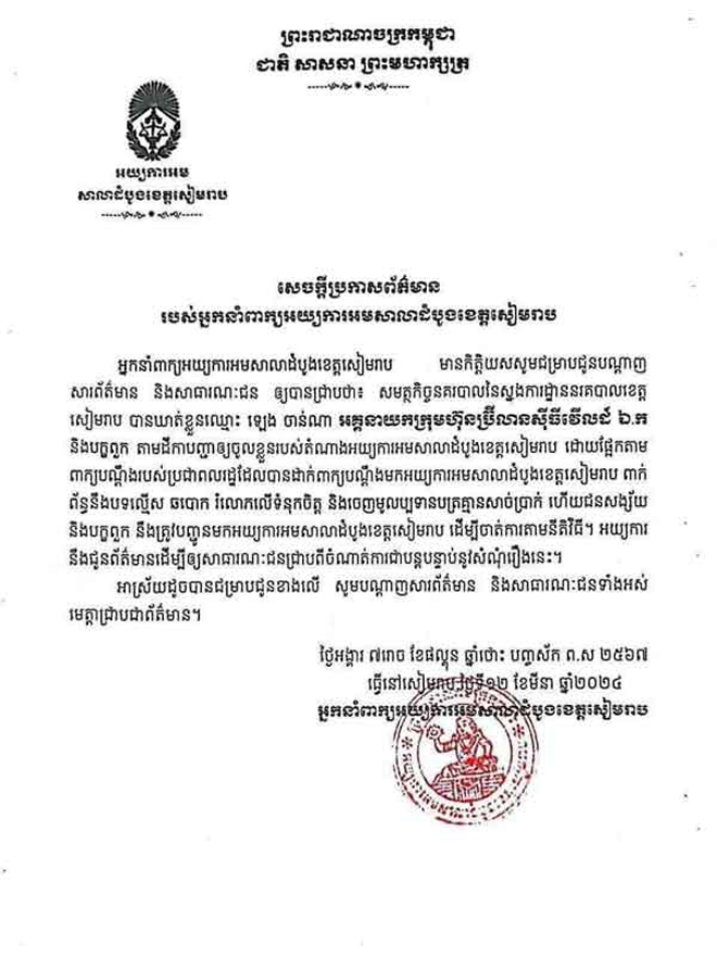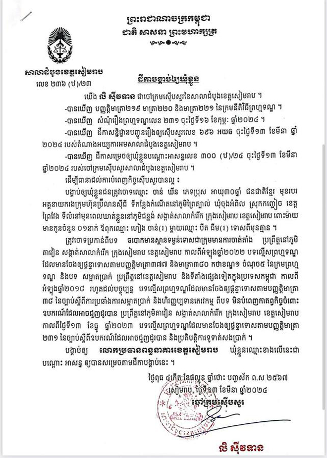 ខេត្តសៀមរាប ៖ សមត្ថកិច្ចនគរបាលព្រហ្មទណ្ឌ កម្រិតធ្ងន់នៃស្នងការនគរបាលខេត្តសៀមរាប បានឃាត់ខ្លួន ឧកញ៉ា ឡេង ចាន់ណា អគ្គនាយកក្រុមហ៊ុន «ប្រ៊ីនលាន ស៉ីធីវើដ៏ ឯ.ក»និងបក្ខពួកចំនួន២នាក់ទៀត ករណីបោកប្រាស់លុយប្រជាពលរដ្ឋរាប់លានដុល្លារ។