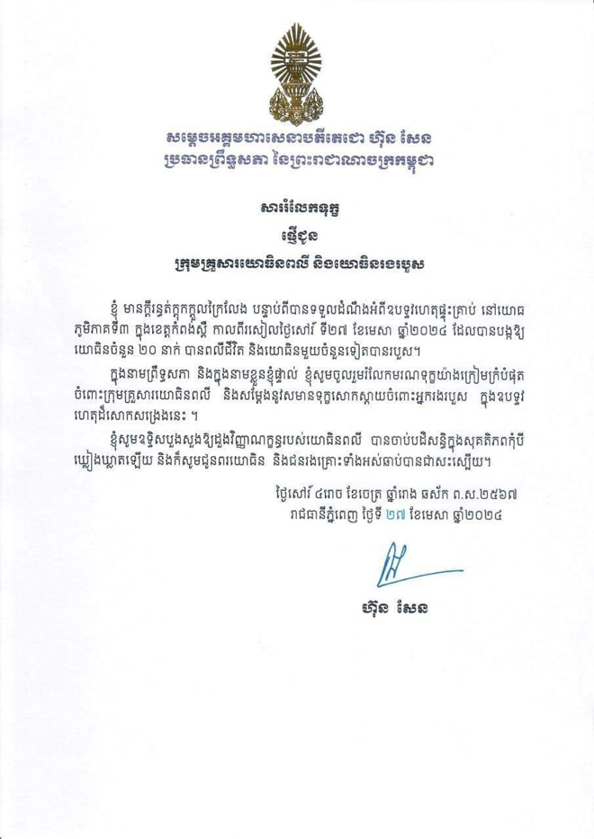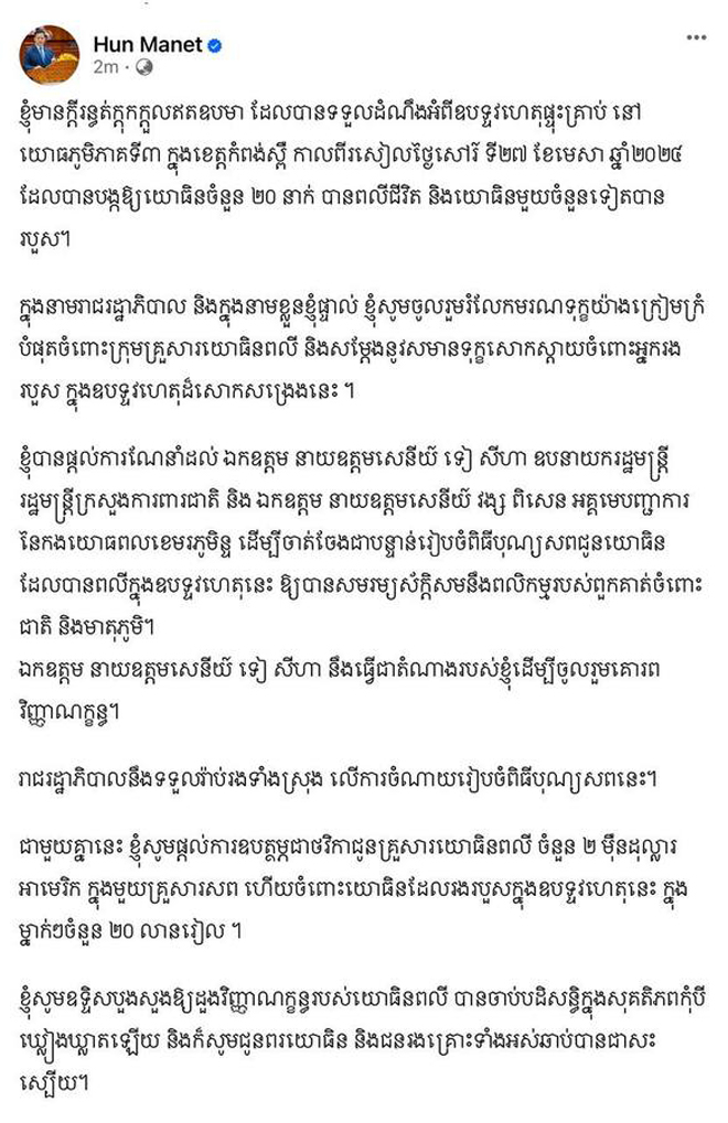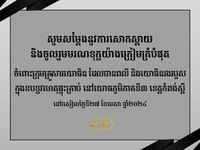 ខេត្តកំពង់ស្ពឺ ៖ សម្ដេចអគ្គមហាសេនាបតីតេជោ ហ៊ុន សែន ប្រធានព្រឹទ្ធសភា និងសម្តេចធិបតី នាយករដ្ឋមន្ត្រី ចូលរួមរំលែកមរណទុក្ខយ៉ាងក្រៀមក្រំបំផុត ចំពោះក្រុមគ្រួសារយោធិនពលី និងសម្តែងនូវសមានទុក្ខសោកស្តាយ ចំពោះអ្នករងរបួសក្នុងឧបទ្ទវហេតុផ្ទុះគ្រាប់នៅយោធភូមិភាគទី៣ ក្នុងខេត្តកំពង់ស្ពឺ។ ចំណែកមន្រ្តីរាជការ ប្រជាពលរដ្ឋក៏បានចូលរួមរំលែកមរណទុក្ខយ៉ាងក្រៀមក្រំបំផុតចំពោះក្រុមគ្រួសារយោធិនពលីផងដែរ។
