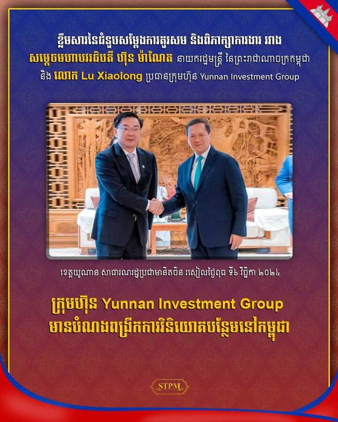 នារសៀល ថ្ងៃទី៦ ខែវិច្ឆិកា ឆ្នាំ២០២៤ សម្តេចមហាបវរធិបតី ហ៊ុន ម៉ាណែត នាយករដ្ឋមន្រ្តី នៃព្រះរាជាណាចក្រកម្ពុជា បានអនុញ្ញាតឱ្យ លោក Lu Xiaolong ប្រធានក្រុមហ៊ុន Yunnan Investment Group ចូលជួបសម្តែងការគួរសម និងពិភាក្សាការងារ នាឱកាសនៃការអញ្ជើញចូលរួមកិច្ចប្រជុំកំពូលមហាអនុតំបន់មេគង្គ (GMS) លើកទី៨ នៅថ្ងៃទី៦-៧ ខែវិច្ឆិកា ឆ្នាំ២០២៤ នៅទីក្រុងគុនមិញ ខេត្តយូណាន សាធារណរដ្ឋប្រជាមានិតចិន។