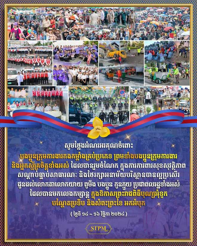 ជាមួយគ្នានេះ ក៏សូមថ្លែងអរគុណដល់ក្រុមការងារសម្តែងសិល្បៈគ្រប់ប្រភេទ ក៏ដូចសិល្ប:ករ សិល្បៈការិនីទាំងអស់ ដែលបានផ្តល់នូវផ្ទាំងទស្សនីយភាពសប្បាយរីករាយ និងការរាំលេងកំសាន្តគ្រប់ទីកន្លែងជូនដល់មហាជន ប្រកបដោយភាពស្រស់ស្រាយសប្បាយអឺងកង»៕ប្រភពអាកាប៉េ