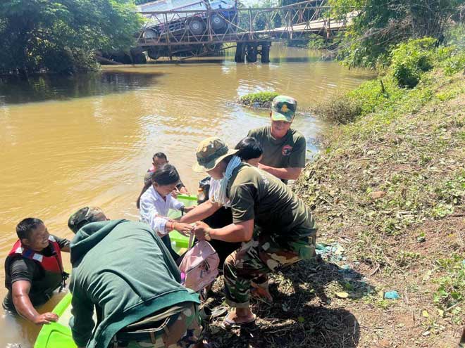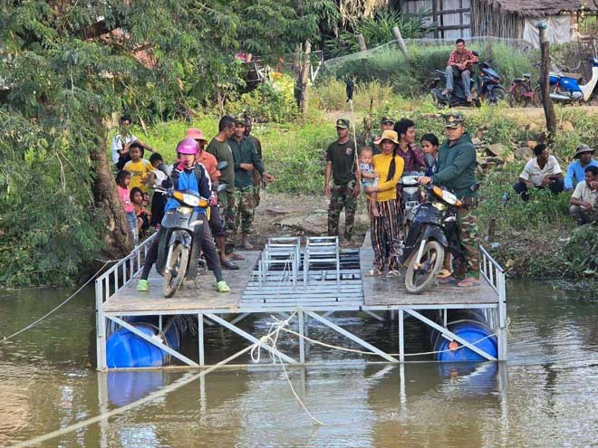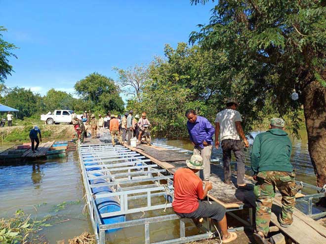 ខេត្តបន្ទាយមានជ័យ ៖ មន្ត្រីអាជ្ញាធរដែនដី ជំនាញសាធារណការនិងដឹកជញ្ជូន អភិវឌ្ឍន៍ជនបទ កងកម្លាំងនគរបាល យោធានិងប្រជាពលរដ្ខបាននាំគ្នាដុតដៃដុតជើងប្រើទូកស្មាច់ធ្វើក្បួននិងស្ពានពោងចម្លងពលរដ្ឋ សិស្សានុសិស្ស ជាពិសេសអ្នកជម្ងឺនិងស្ត្រីមានផ្ទៃពោះត្រូវទៅសម្រាលកូនជាបណ្តោះអាសន្នបន្ទាន់ ។ពោលគឺបន្ទាប់ពីរថយន្តធុនធំដឹកស្រូវបង្កបាក់ស្ពានដែកបេឡ ហើយកាត់ផ្តាច់ចរាចរណ៍កាលពីថ្ងៃទី២១ ខែវិច្ឆិកា ឆ្នាំ២០២៤ វេលាម៉ោង១៩.០០នាទីយប់ កន្លងមកនៅភូមិអូរភូមិ ឃុំផ្គាំ ស្រុកស្វាយចេក ខេត្តបន្ទាយមានជ័យ។