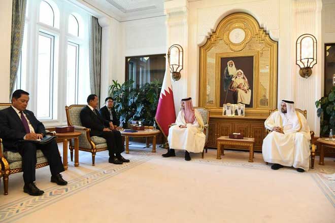 សម្តេចអគ្គមហាសេនាបតីតេជោ ហ៊ុន សែន ប្រធានព្រឹទ្ធសភាកម្ពុជា បានអញ្ជើញជួបពិភាក្សាការងារជាមួយ ឯកឧត្តម សេក្ខ មហាម៉េដ ប៊ីន អាប់ឌុលរ៉ាហ្សម៉ាន់ ប៊ីន ចាស់ស៊ីម អាលថានី (Mohammed Bin Abdulrahman bin Jassim Al Thani) នាយករដ្ឋមន្ត្រី និងជារដ្ឋមន្ត្រីការបរទេសនៃរដ្ឋកាតា នៅទីក្រុងដូហា ប្រទេសកាតា នៅព្រឹកថ្ងៃអង្គារ ទី១០ ខែធ្នូ ឆ្នាំ២០២៤៕ប្រភពអាកាប៉េ