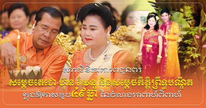 នៅក្នុងឱកាសដ៏សិរីមង្គលាភិរម្យប្រសើរថ្លៃថ្លានេះ យើងខ្ញុំសូមគោរពអនុញ្ញាតសម្តែងនូវអំណរសាទរ យ៉ាងស្មោះអស់ពីដួងចិត្ត ប្រកបដោយមនោសញ្ចេតនា រំភើបរីករាយក្រៃលែង និងសូមបួងសួងដល់ទេវតា វត្ថុស័ក្តិសិទ្ធិទាំងឡាយក្នុងលោក សូមប្រសិទ្ធពរជ័យដល់ចំណងអាពាហ៍ពិពាហ៍ ដែលបានកើតឡើងក្នុងគ្រាដ៏សែនកម្សត់នោះ ឱ្យកាន់តែផ្អែមល្ហែម ត្រជាក់ត្រជំដូចទឹកអម្រឹត និងសូមប្រកបដោយសុខភាពល្អបរិបូរណ៍ កម្លាំងពលំមាំមួន ជន្មាយុយឺនយូរ និងសម្រេចបាន ជោគជ័យយ៉ាងត្រចះត្រចង់ ក្នុងការបន្តចូលរួមដឹកនាំប្រទេស ដើម្បីអភិវឌ្ឍលើគ្រប់វិស័យ មានភាពរីកចម្រើនរុងរឿង ក្រោមដំបូលមហាសន្តិភាព ស្ថិរភាពជានិច្ចនិរន្តរ៍តរៀងទៅ។