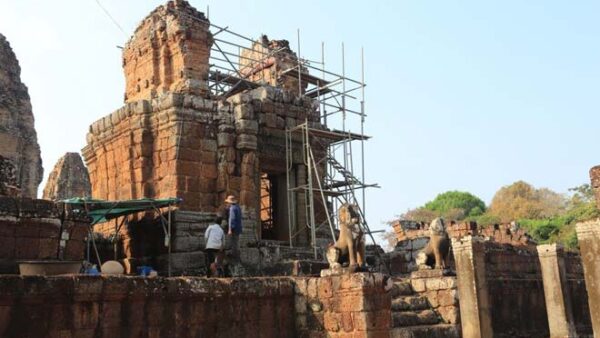 ក្រុមអ្នកបច្ចេកទេស អាជ្ញាធរជាតិអប្សរា ទល់ទ្រខ្លោងទ្វារខាងជើង ប្រាសាទមេបុណ្យខាងកើត ដែលទ្រុឌទ្រោមខ្លាំង